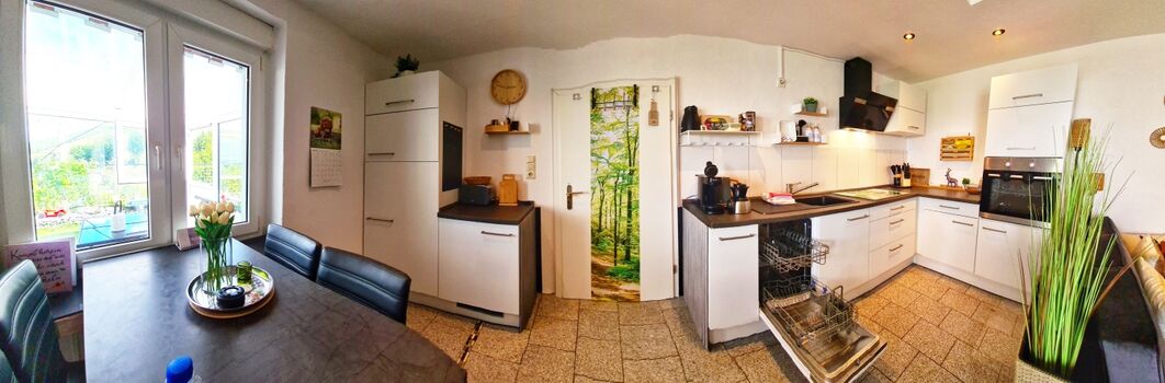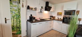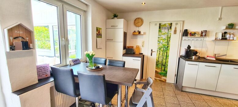 Cerankochfeld, Dunstabzugshaube, Kühlschrank mit Gefrierfach, Gefrierschrank, Senseo-Kaffeeautomat, Mixer, Korkenzieher / Flaschenöffner, Gewürze (Salz, Pfeffer, Zucker), Öl / Essig, Geschirrhandtücher, Mülltüten, Essplatz in der Küche, TV in der Küche