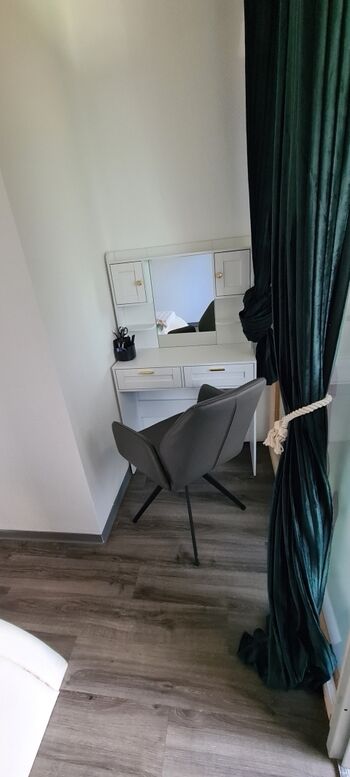 Schlafen & Träumen – Ihr Rückzugsort zum Wohlfühlen Unser liebevoll eingerichtetes Schlafzimmer ist der perfekte Ort, um nach einem erlebnisreichen Urlaubstag zur Ruhe zu kommen und neue Energie zu tanken. Ein komfortables Doppelbett sorgt für erholsamen Schlaf, während eine großzügige Garderobe mit Hängemöglichkeit und Schubkästen genügend Platz für Ihre Kleidung und persönlichen Dinge bietet. Zusätzlich steht Ihnen ein praktischer Schreibtisch, der auch als Schminktisch mit Spiegel+Licht und bequemen Drehsessel genutzt werden kann, zur Verfügung – ideal für kleine Arbeiten zwischendurch oder um sich in Ruhe fertig zu machen. Für Familien stellen wir auf Wunsch gerne kostenlos ein Kinderreisebett bereit, damit sich auch unsere kleinsten Gäste rundum wohlfühlen. Bettwäsche können Sie bequem hinzubuchen (15 € pro Person) – so reisen Sie ganz entspannt ohne großes Gepäck an. Hier können Sie es sich einfach gemütlich machen, abschalten und den Tag entspannt ausklingen lassen. Doppelbett 1,80 x 2,00m, Kommode, Wecker, Spiegel, Leselampe am Bett