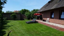 Der große eingewachsene Garten mit Terrasse, Rasenfläche, Gartenmöbeln und Strandkorb ist komplett eingezäunt.
