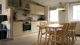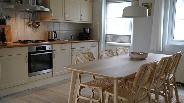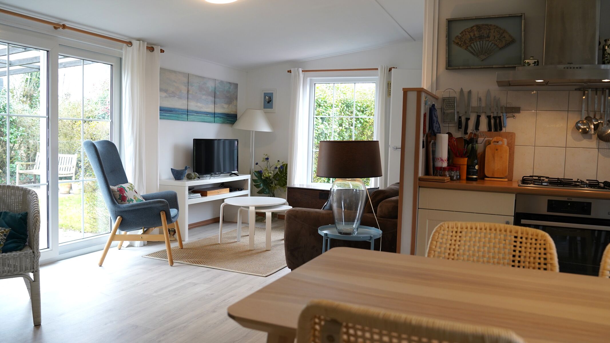"De Groene Hoek" verfügt über ein geräumiges Wohnzimmer mit offener Küche. Das Wohnzimmer verfügt über eine gemütliche Sitzecke mit einem Sofa und 2 Stühlen rund um den Fernseher. Der runde Essbereich bietet Platz für 4 Personen.