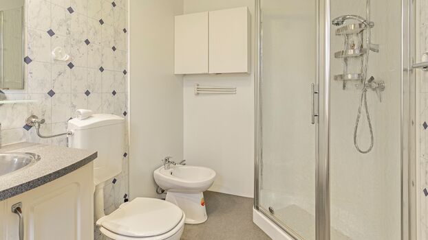 Es gibt 2 Schlafzimmer, eines mit einem Doppelbett, das andere mit 2 Einzelbetten. Es gibt ein geräumiges Badezimmer mit Dusche, Waschbecken, Toilette, Bidet und Waschmaschine.