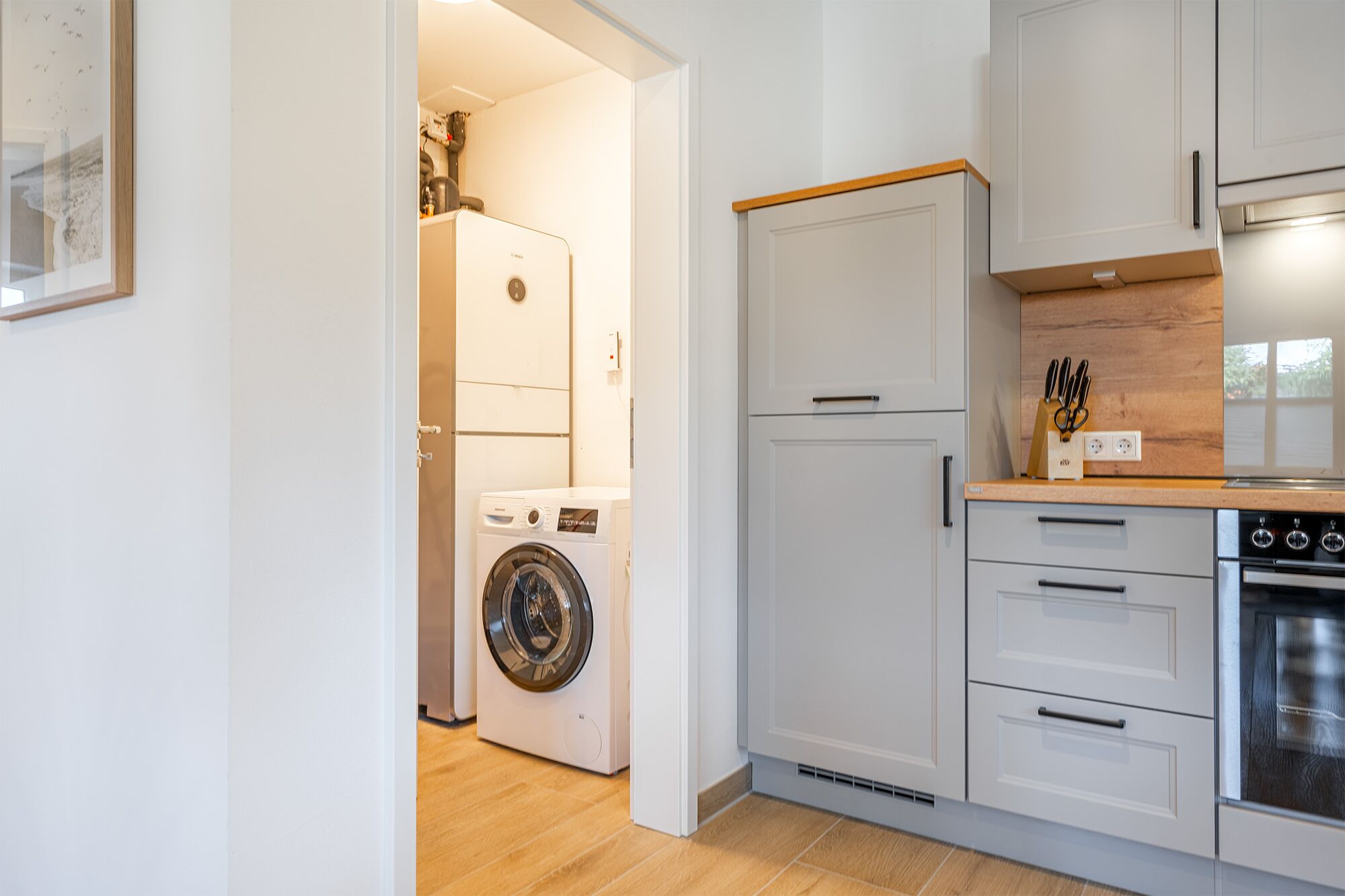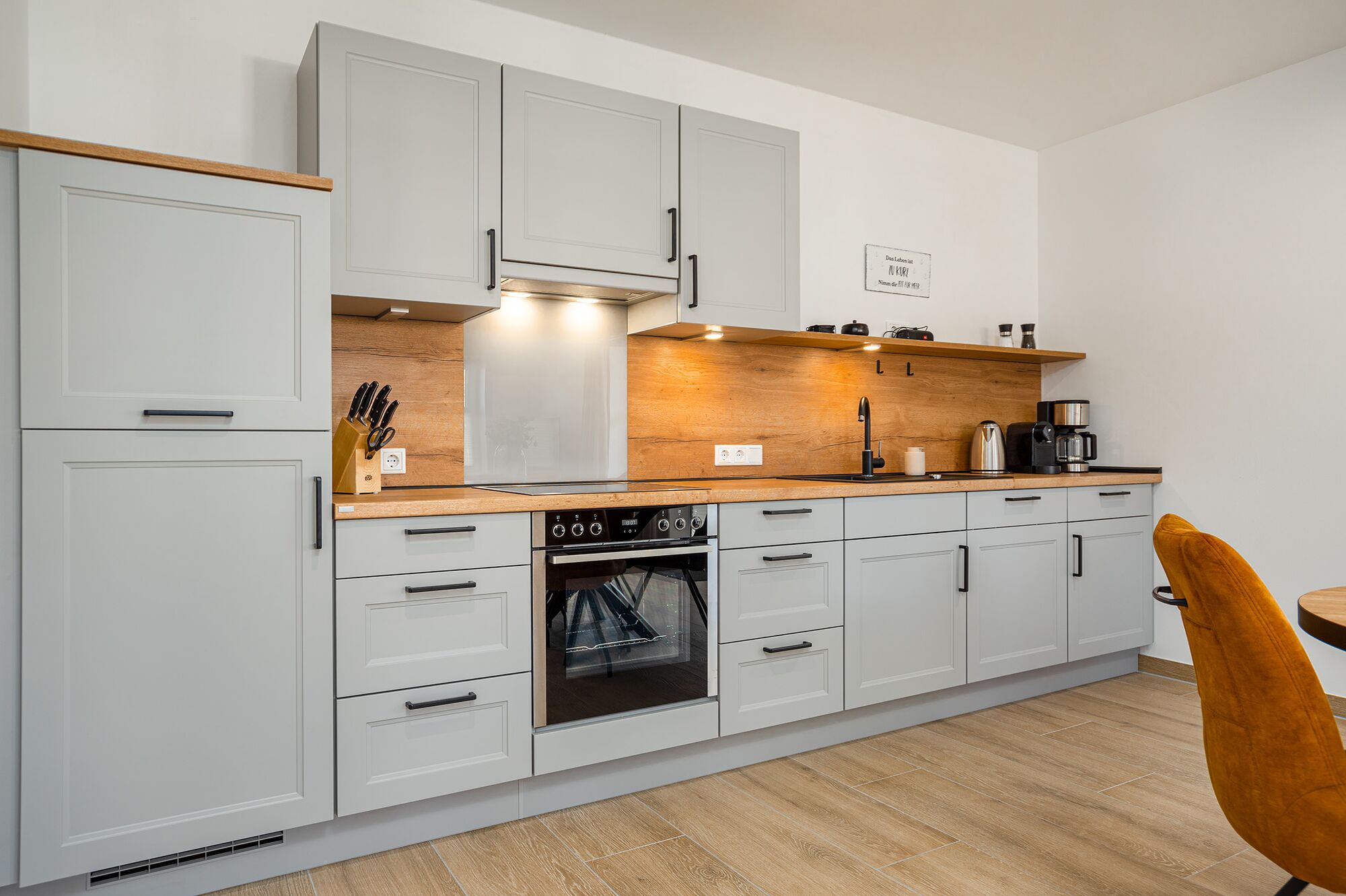 Cerankochfeld, Dunstabzugshaube, Kühlschrank mit Gefrierfach, Korkenzieher / Flaschenöffner, Essplatz in der Küche