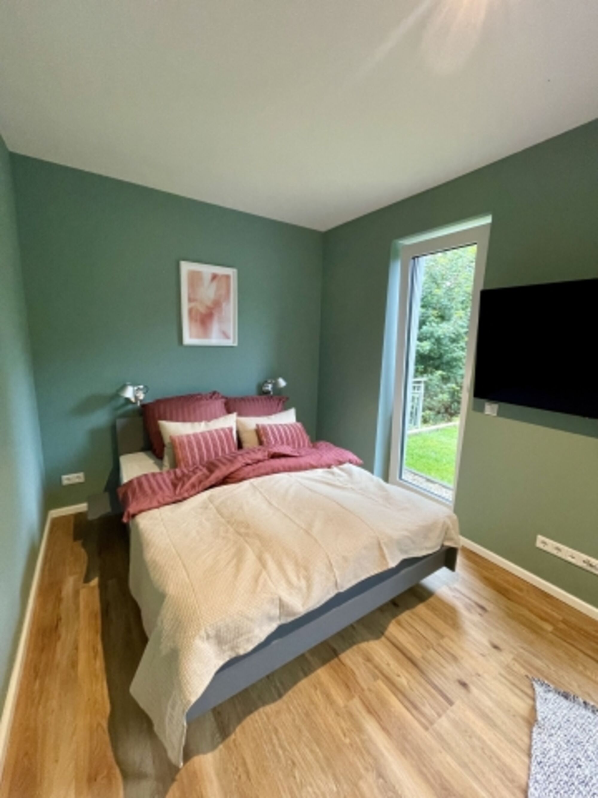 Unsere Oase am See & 2 Schlafzimmern bietet mit einer Größe von ca. 65qm Platz für 4 Gäste und gerne mit Hund (max. 3). Vom Eingangsbereich gelangt man in alle drei angrenzenden Räume, wie in den beiden Schlafzimmern mit 1,60m gemütlichem Doppelbett, einem 55 Zoll TV und einem Einbauschrank um euer Gepäck verstauen zu können. Es gibt ein etwas größeres und ein kleineres Schlafzimmer. Beide Schlafzimmer liegen nach hinten zum Parkplatz raus und sind sehr ruhig. In jedem Schlafzimmer haben wir Fliegengitter und ein paar Spielzeuge für Kinder. Ein Reisebett steht ebenfalls zur Verfügung. Jeder der 3 TV Geräte ist mit Netflix ausgestattet.