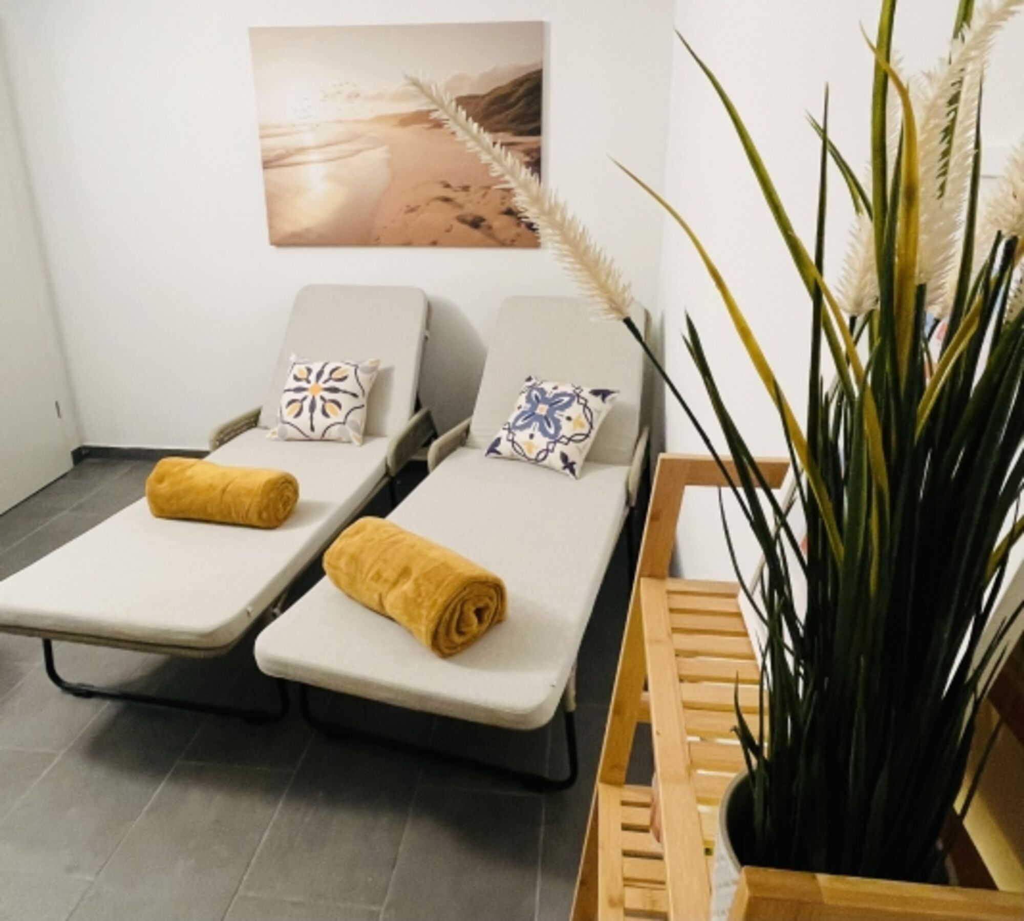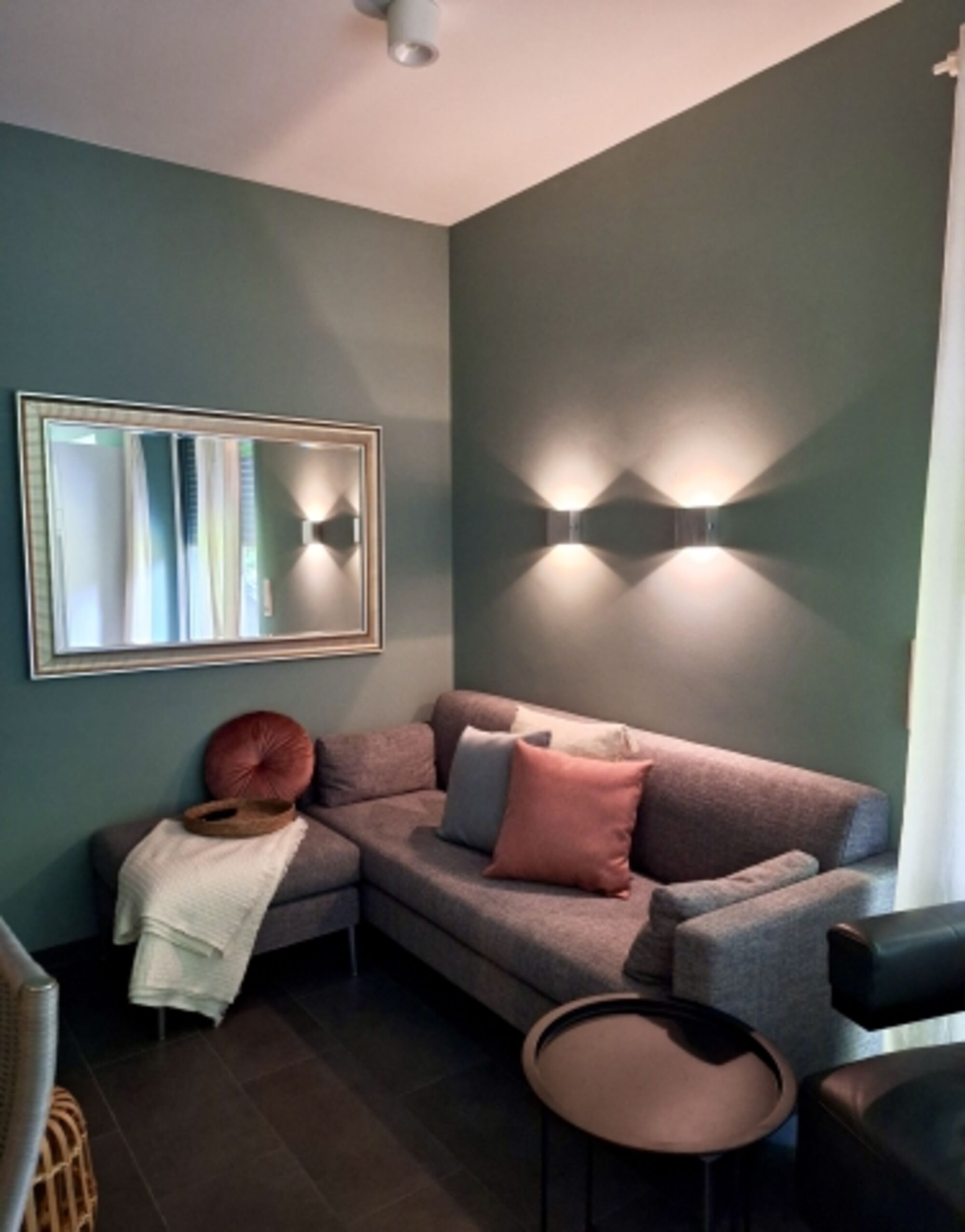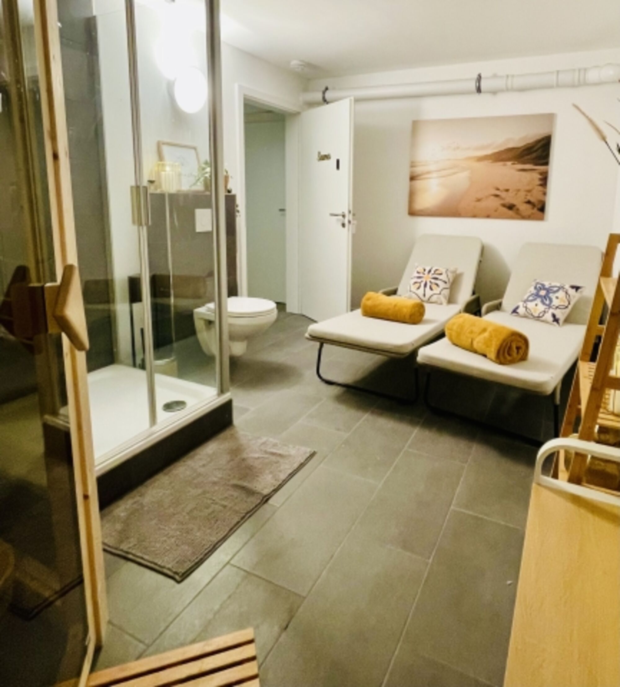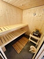 Im Keller befindet sich eine kleine Wellnessoase mit 2 Liegen, Dusche und WC. Die Sauna ist gegen Aufpreis (ab 10€/Person) Inklusive Bademantel, Handtuch und Saunaaufguss nutzbar.