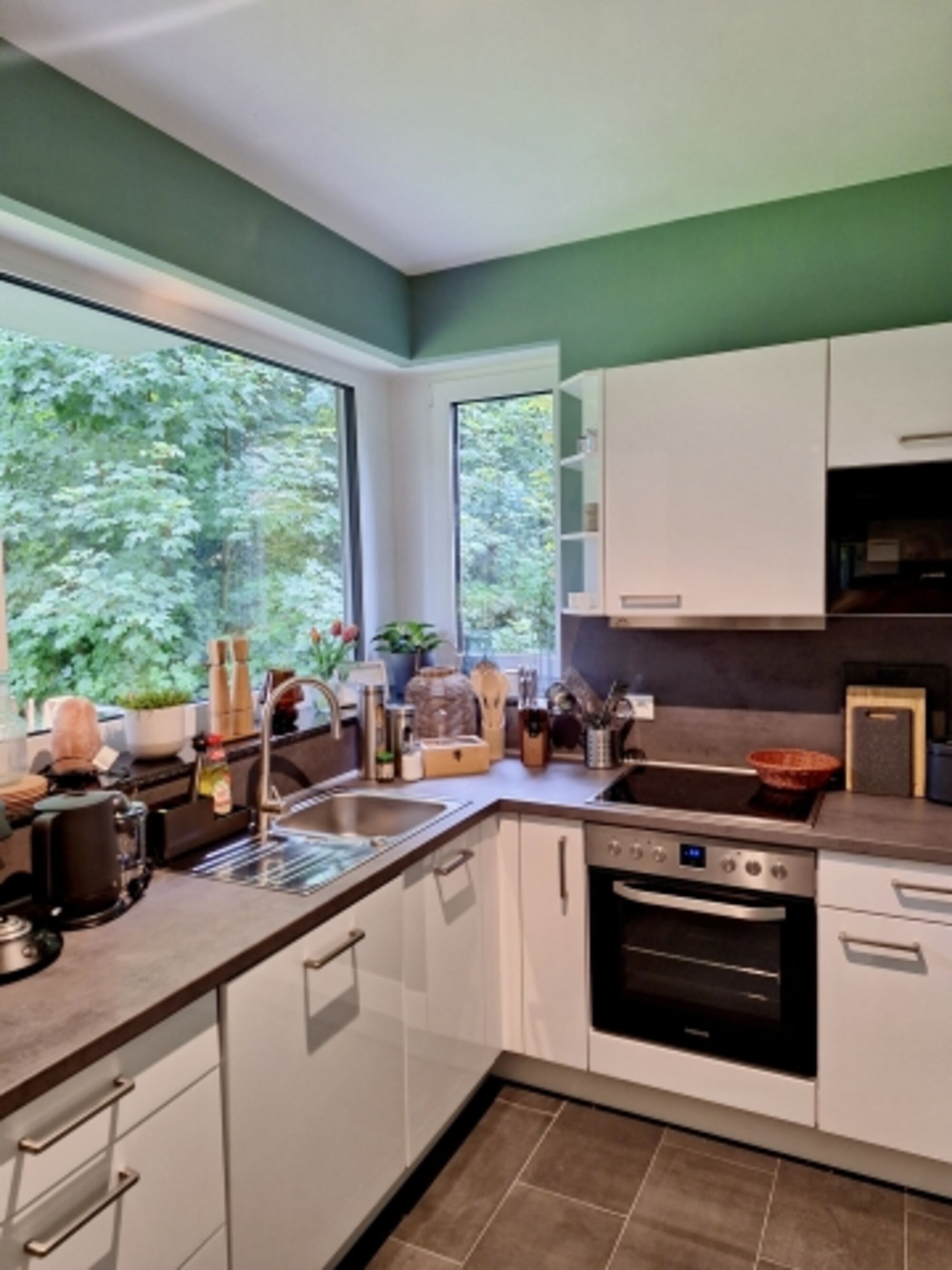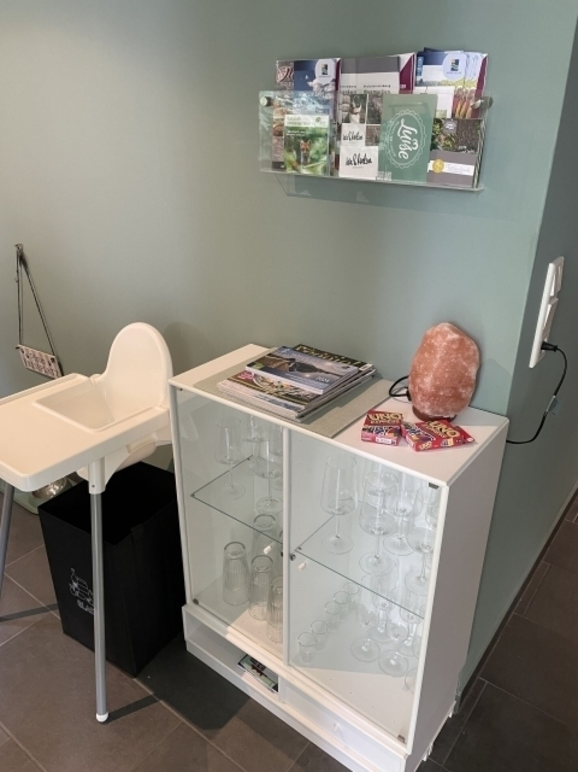 Der Wohnbereich hat eine kuschelige Nische mit 3er-Sofa, Sessel und TV, voll ausgestatteter Küchenzeile mit einigen Extras und einem Esstisch. Für unsere Gäste stehen immer Kaffee, Tee, Gewürze, Öl, Essig, Spültabs und Spülmittel zur Verfügung. In der Küche stehen zusätzlich Schalen und Löffel für Babys zur Verfügung.