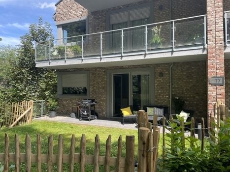 Vom Wohnbereich grenzt die Terrasse mit Gasgrill und eingezäunten Garten.