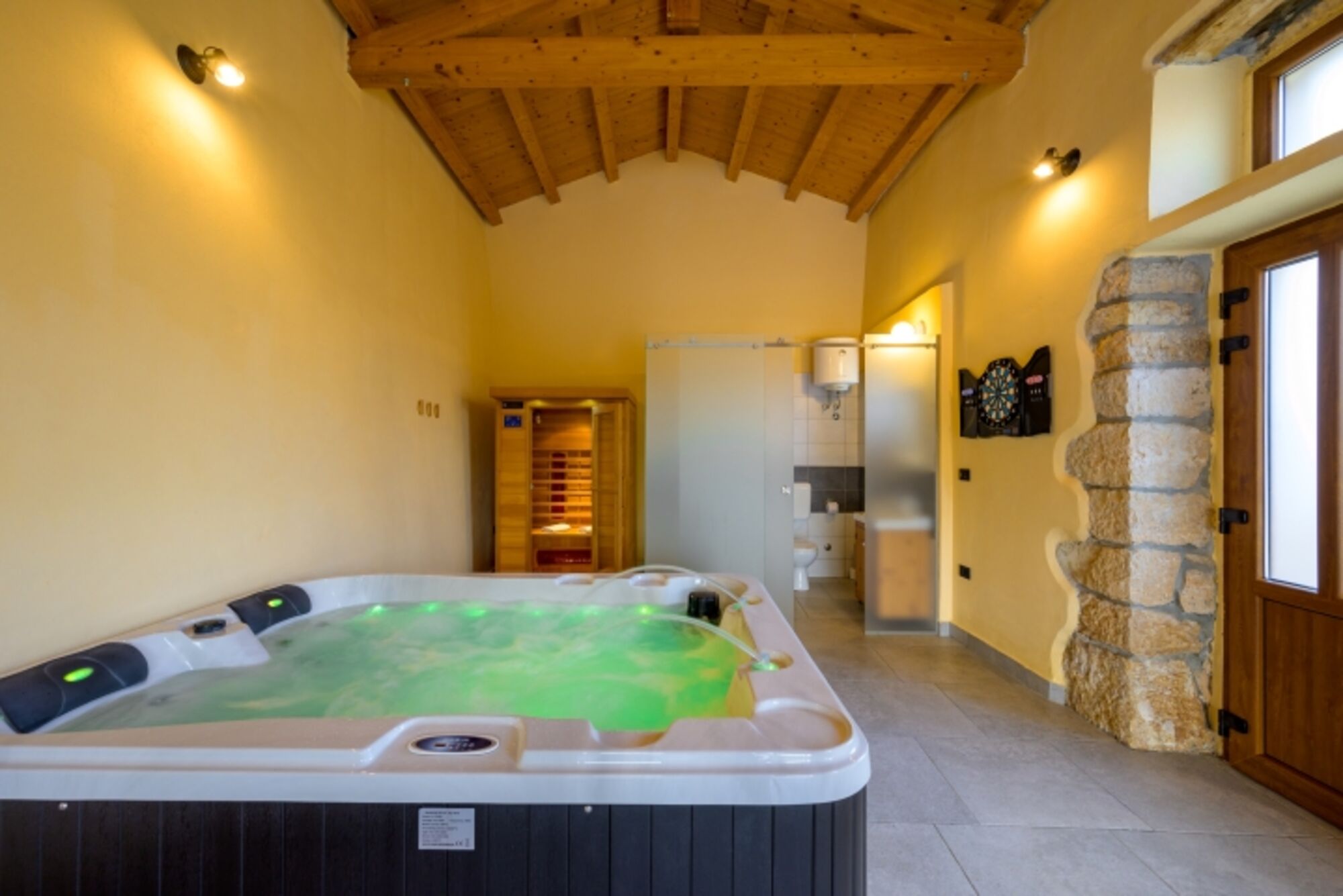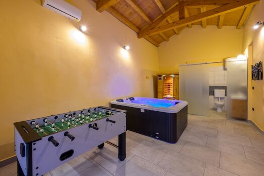 Für ein komplettes Wellness-Erlebnis verfügt die Villa über eine Sauna und einen Jacuzzi, die den Gästen völlige Entspannung und Regeneration ermöglichen. Die großzügige Außenterrasse und der Essbereich sind ideal, um Mahlzeiten im Freien zu genießen. Alles ist sorgfältig gestaltet, um eine warme und gemütliche Atmosphäre zu schaffen, die rustikalen Charme mit modernem Luxus verbindet. Für zusätzlichen Spaß stehen den Gästen Tischfußball, Darts und ein Kinderspielplatz zur Verfügung.
