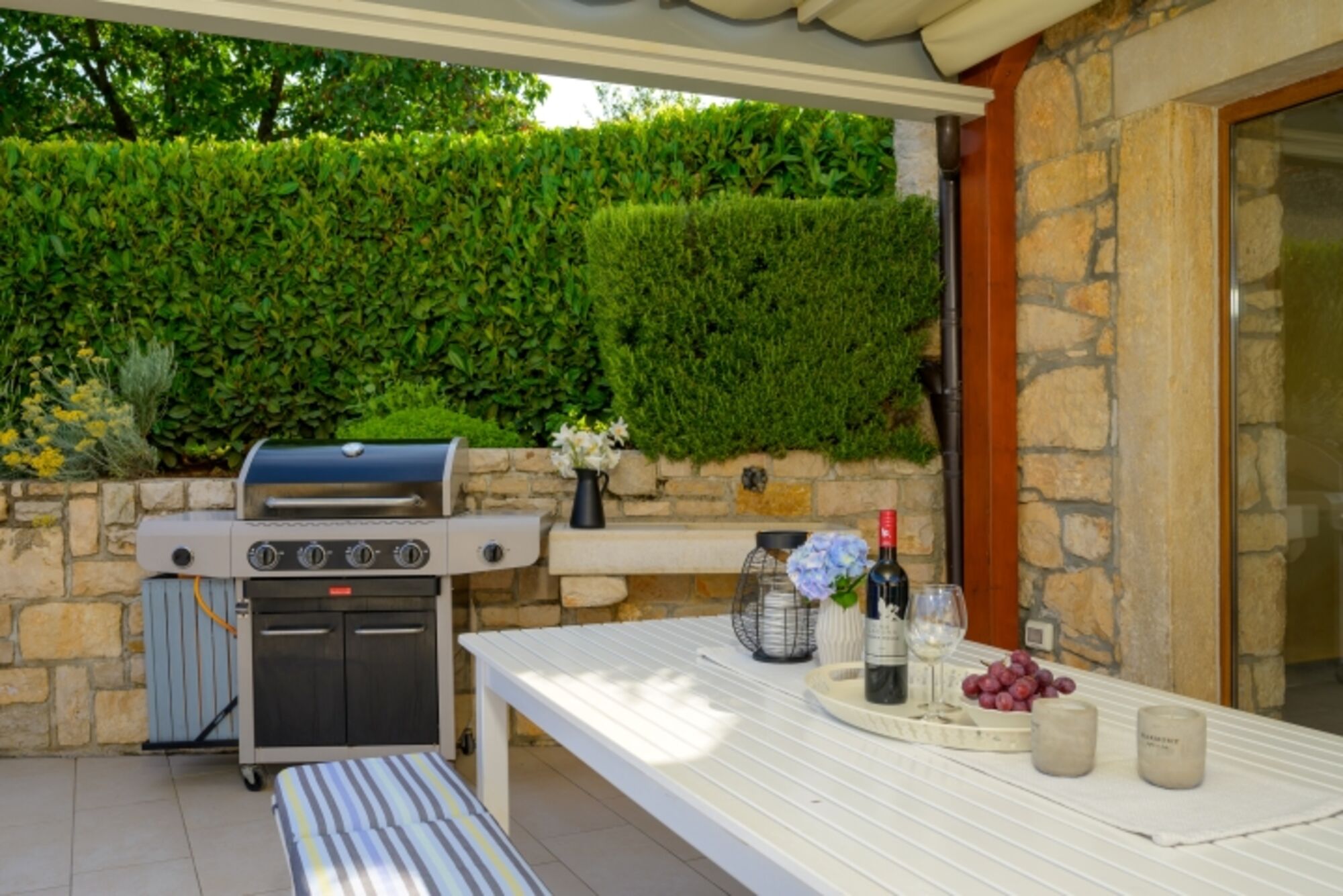 Liegewiese, Gartenmöbel, Elektrogrill, Hof, Markise