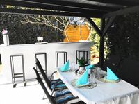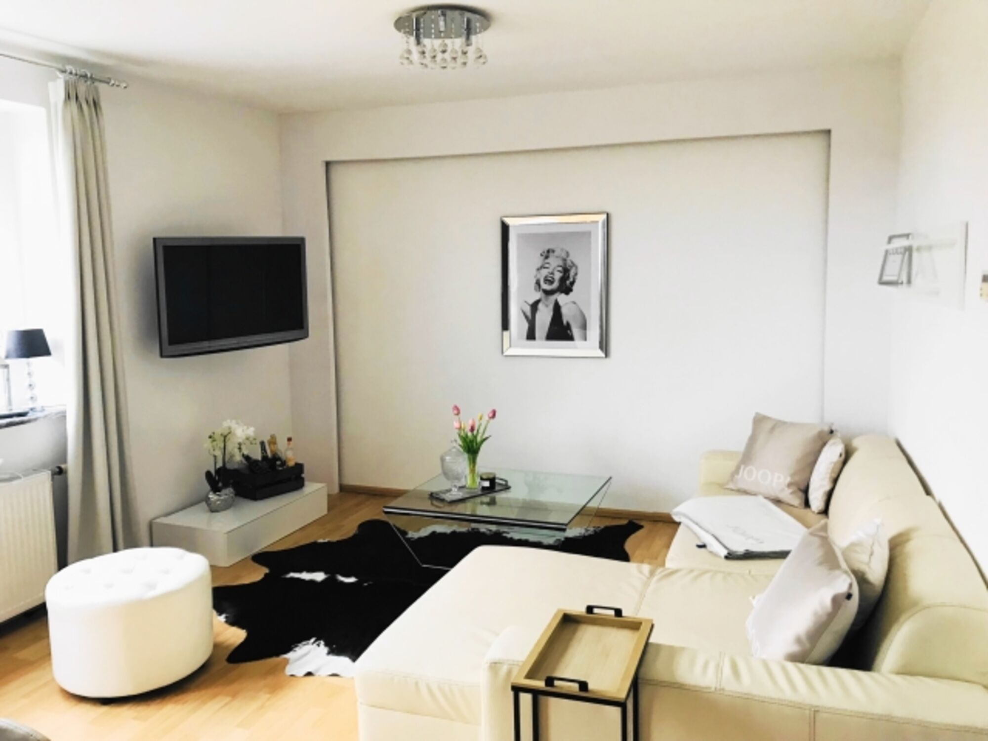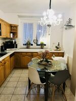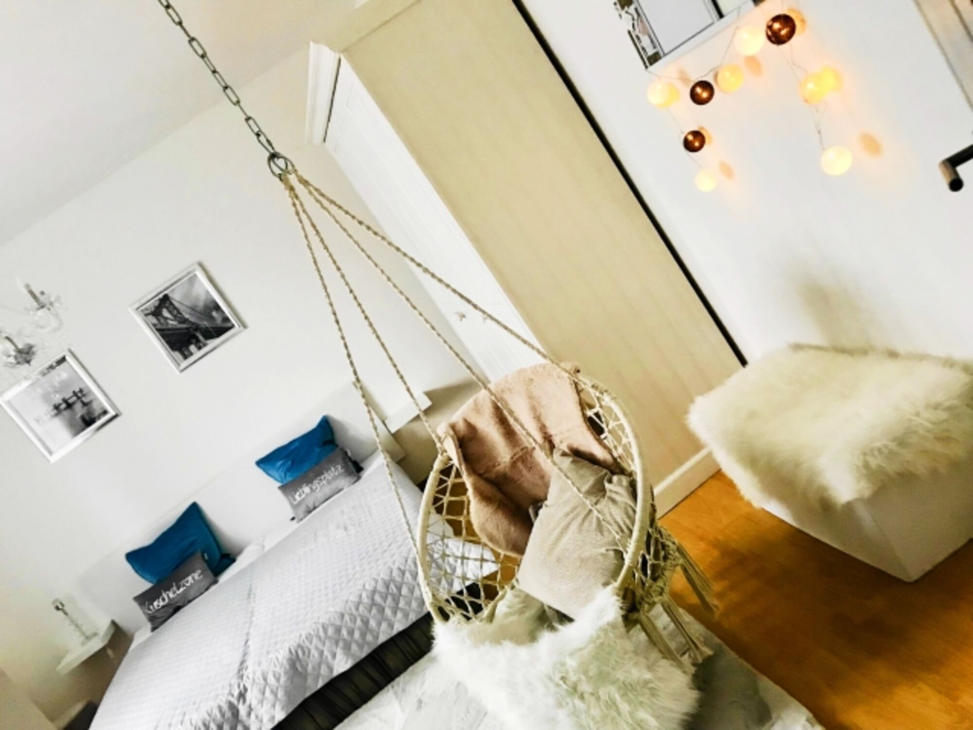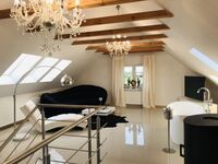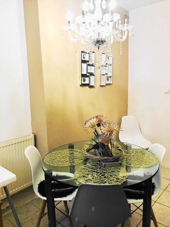 Beide Schlafzimmer sind schick und groß. Ein Schlafzimmern ist mit einen Fernseher und sogar einer Schaukel ausgestattet. Zusätzlich zu den Schlafräumen haben wir ein luxuriöses Wohnzimmer für Sie eingerichtet. Auf der bequemen Ledercouch können Sie entspannen und/oder Sat-TV schauen. An dem großen Esstisch unter dem stilvollen Kronleuchter können Sie romantisches Essen zu zweit oder Familienessen genießen. Vom Wohnzimmer aus haben Sie Zugang zu einer Terrasse. Unsere Küche ist sehr gut ausgestattet, Sie finden hier alles, was Sie zum Kochen brauchen. Das Badezimmer ist ebenfalls groß und mit einer Badewanne ausgestattet.