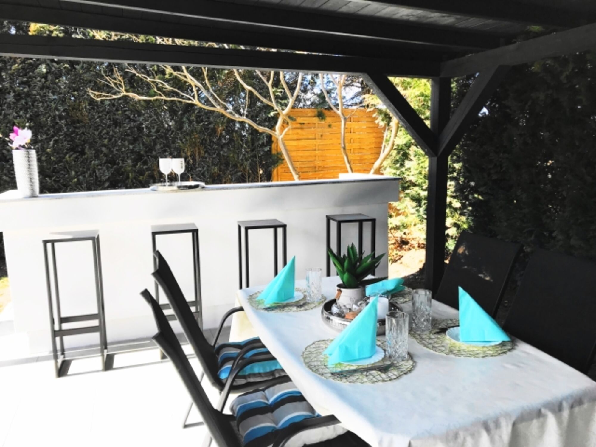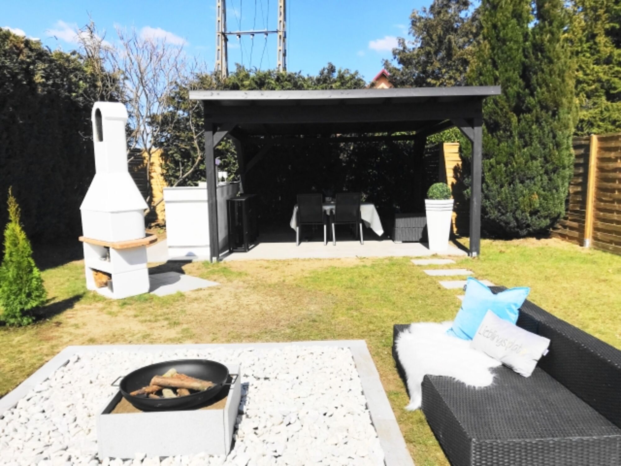 Auch unser Außenbereich macht Ihren Urlaub bei uns attraktiver. In dem großen umzäunten Garten oder auf der Terrasse können frische Luft und die Sonne genießen. Bequeme Gartenmöbel, Kamingrill und unsere überdachte Outdoorküche warten hier auf Sie. Egal ob Sie mit Ihren Kindern oder Ihrem Haustier unser Ferienhaus buchen, es ist genug Platz für alle da.