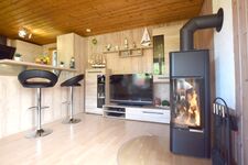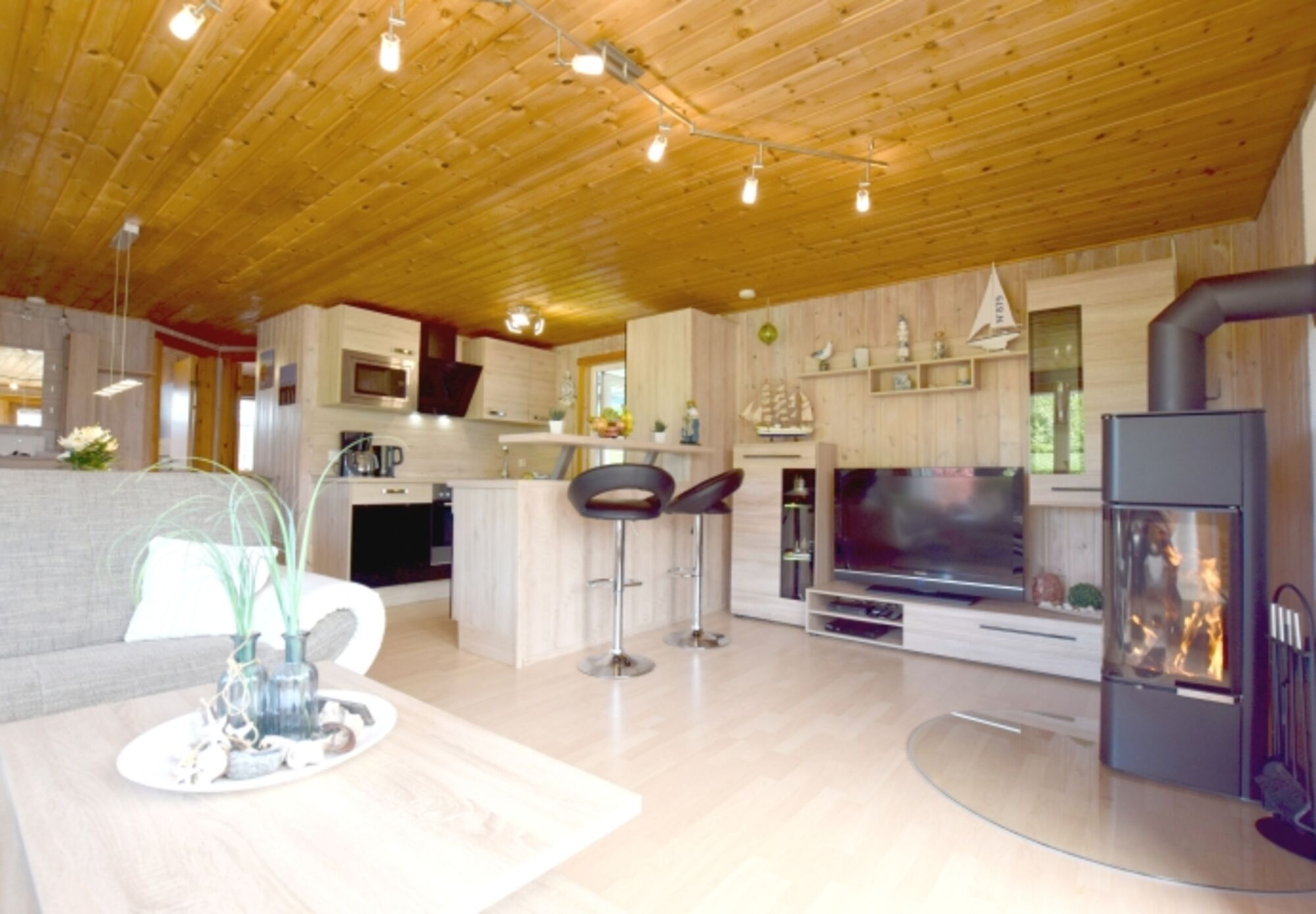 Das Herzstück des Hauses, ein großer Wohnraum mit Sprossenfenstern und offenem Dachgiebel, Kaminofen, Essplatz und Küchenzeile wird durch einen Flur direkt vom Eingang erschlossen. Zwei Schlafzimmer und ein Duschbad komplettieren das Raumangebot im Erdgeschoss.