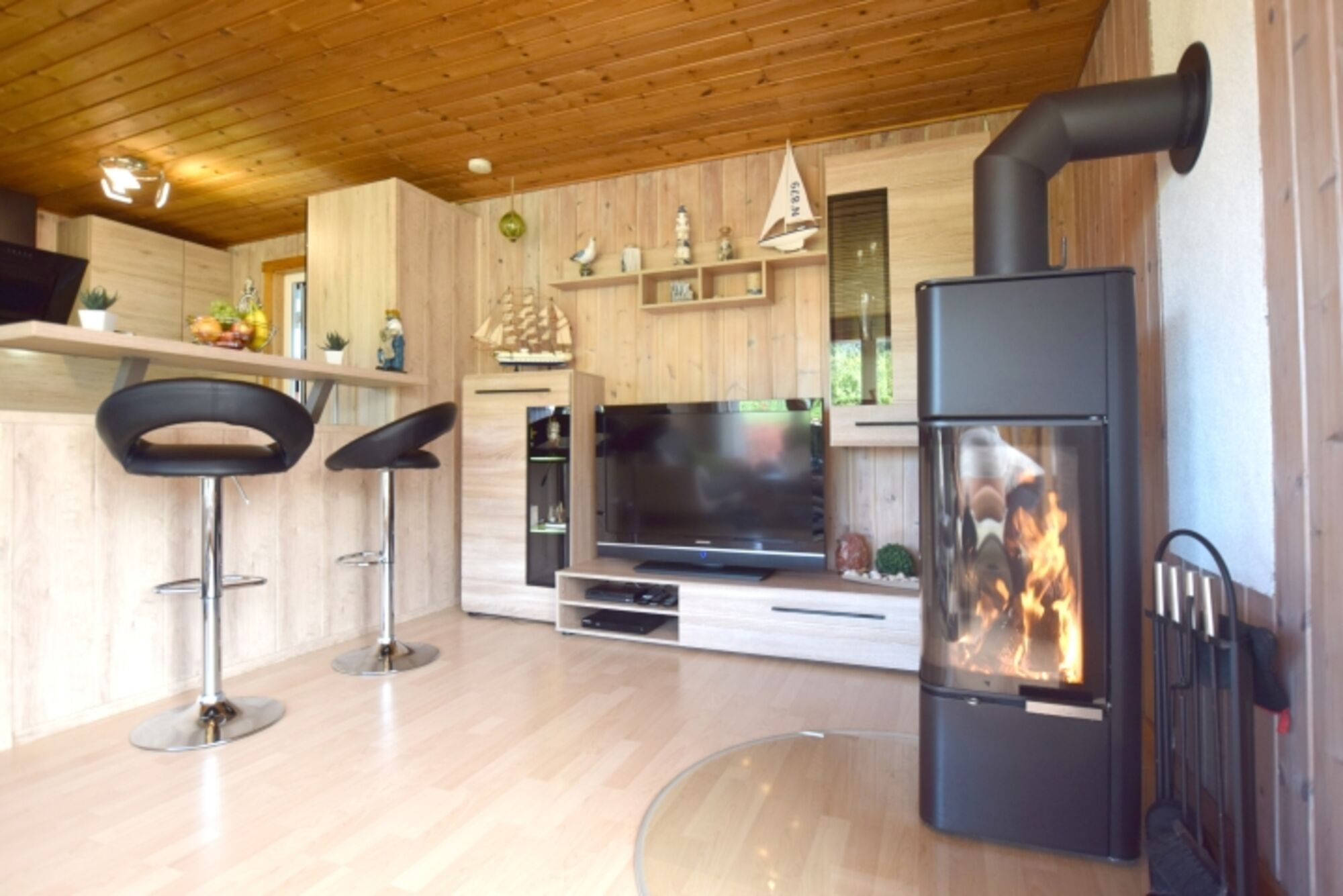 TV, TV-Flachbildschirm, HDTV Flachbildschirm, DVD-Player, Blu-Ray-Player, Bücher, Kaminofen, 3er-Sofa, 2er-Sofa, Sessel