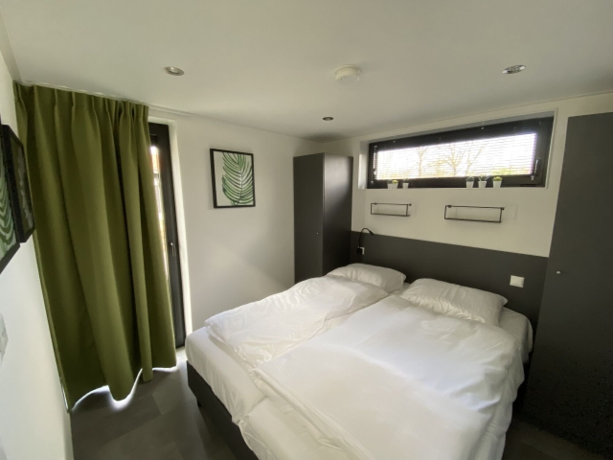 Master-Schlafzimmer mit hochwertigen Boxspringbetten und ein Badezimmer en-suite für mehr Privatsphäre. Bezogene Betten bei Ankunft inklusive. Mit hochwertigen Insektenschutzgittern. Kühlfunktion für den Innenraum. Babybett / Kleinkindbett optional beistellbar. Doppelbett 1,60 x 2,00m, Boxspringbett, Spiegel, Leselampe am Bett, Fliegengitter