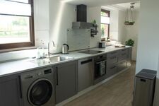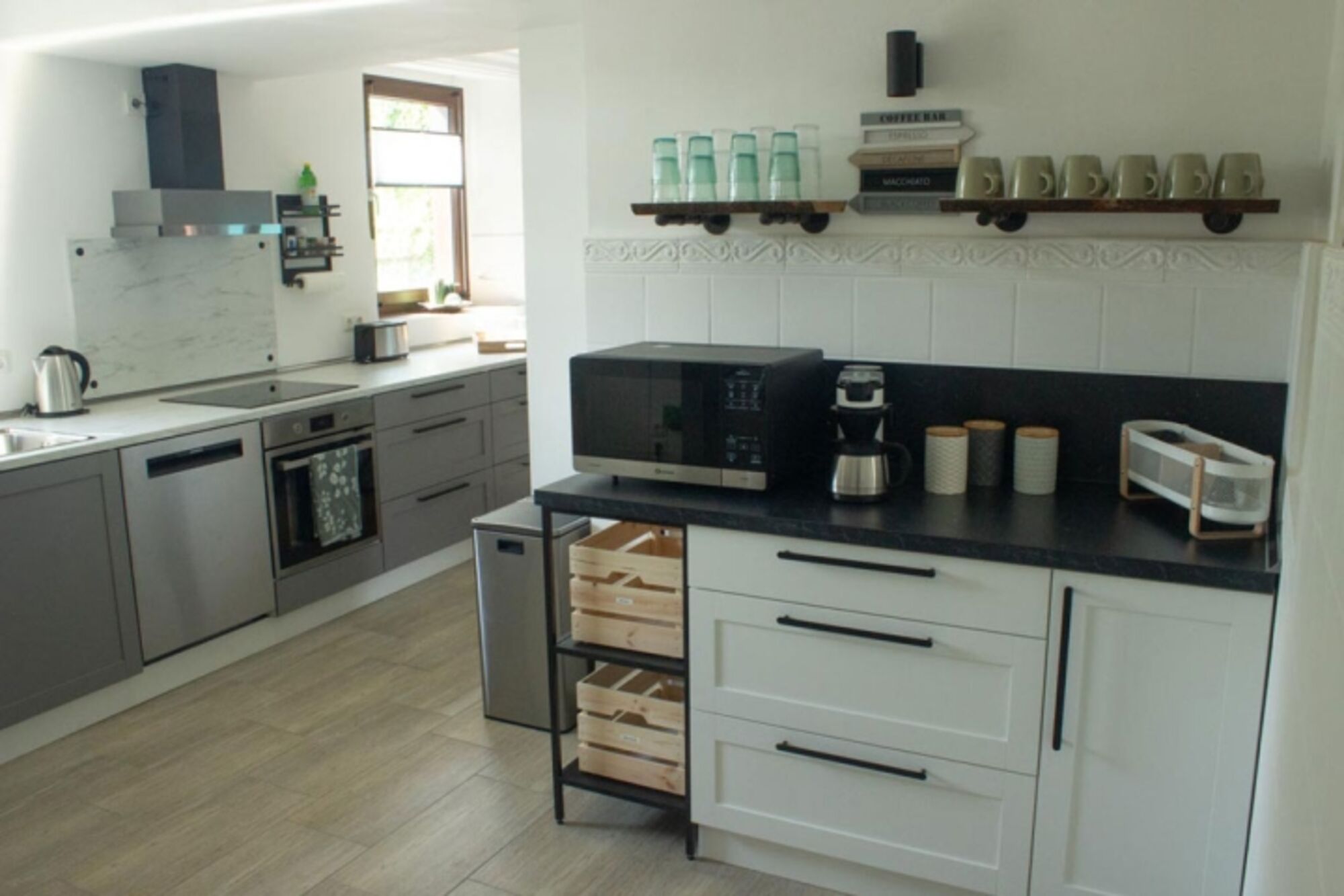4-Platten Herd, Induktionsherd, Dunstabzugshaube, Gefrierschrank, Senseo-Kaffeeautomat, Korkenzieher / Flaschenöffner, Gewürze (Salz, Pfeffer, Zucker), Öl / Essig, Geschirrhandtücher, Mülltüten