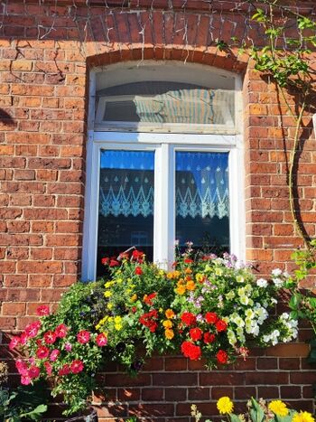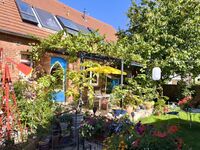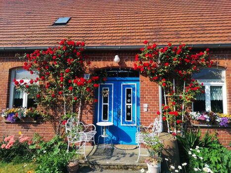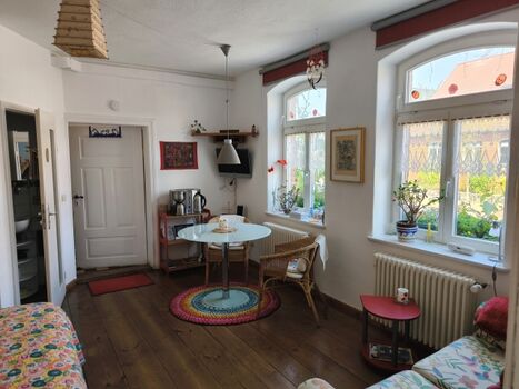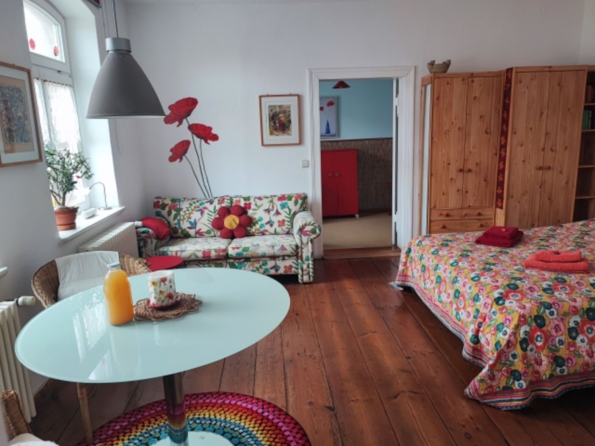 Wenn Sie unser Appartement Mohnblüte mit alleinigem Eingang vorne durch die schöne blaue Tür unseres Hauses buchen, erwartet Sie ein großes Doppelzimmer mit integriertem Duschbad/WC, einem runden Esstisch, TV und ein 2. angrenzendes Schlafzimmer mit 2 Einzelbetten. Hier können wir individuell nach Ihren Wünschen ein Kinderbett aufstellen (ist vorhanden!) In der kleinen, aber komplett ausgestatteten Küche im Vorflur gibt es einen Herd mit 2 Kochplatten mit Backofen, eine Mikrowelle, einen Kühlschrank, Kaffeemaschine, Wasserkocher, Toaster und ausreichend Geschirr, ein Geschirrspüler sowie Koch - und Backutensilien.