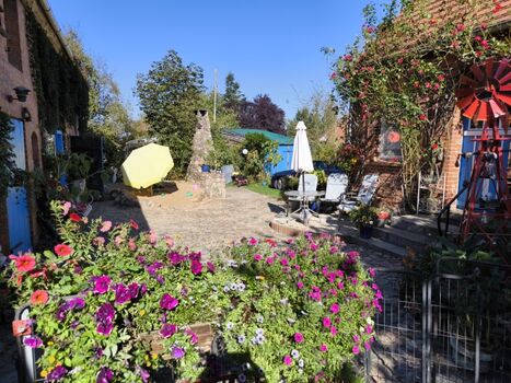 Auf der kleinen Terrasse auf dem Treppenabsatz vor dem Haus stehen 2 »Klön – Bänke« wo Sie den Tag in der Morgensonne begrüßen oder den Abend ausklingen lassen können. Sie haben aber auch einen direkten Zugang zum Garten über unseren Hof und zu den separaten Gemeinschaftsräumen der Sommer Lounge und den mediterranen Wintergarten in unserer zum Anwesen gehörenden Scheune! (nutzbar von ca. Mitte April – Mitte Oktober) Hier können Sie auch außerhalb des Appartements zusammen sitzen, spielen, essen, feiern oder einfach nur lesen oder entspannen. Im Garten gibt es einen überdachten Sitzplatz unter einem Pavillon und im Hof eine überdachte Terrasse mit ausreichend Sitzgelegenheiten. Zusätzlich gibt es die private Liegewiese direkt am Fluss (Elde) mit Sonnenliegen. Hier darf auch der Hund ins Wasser.