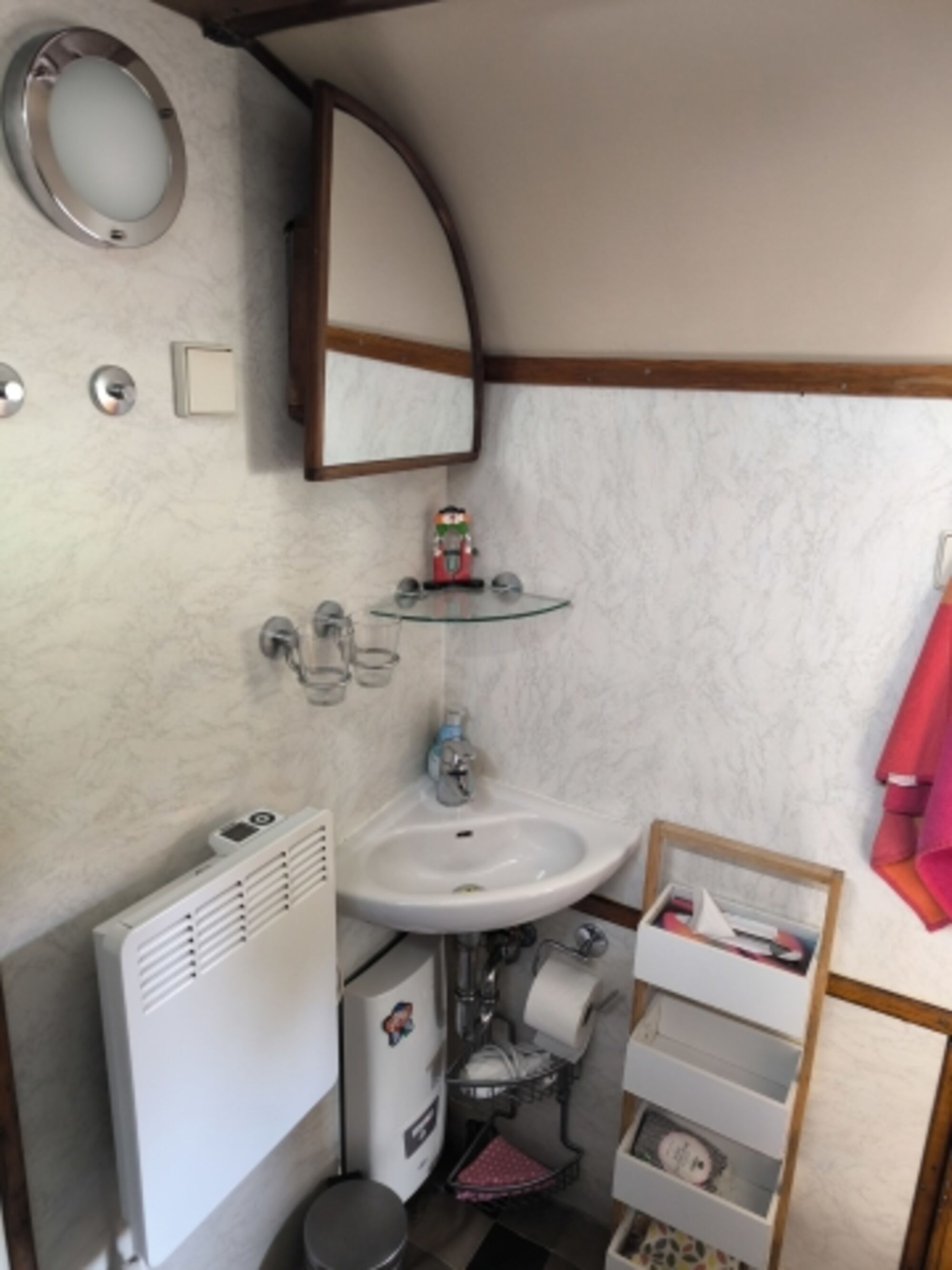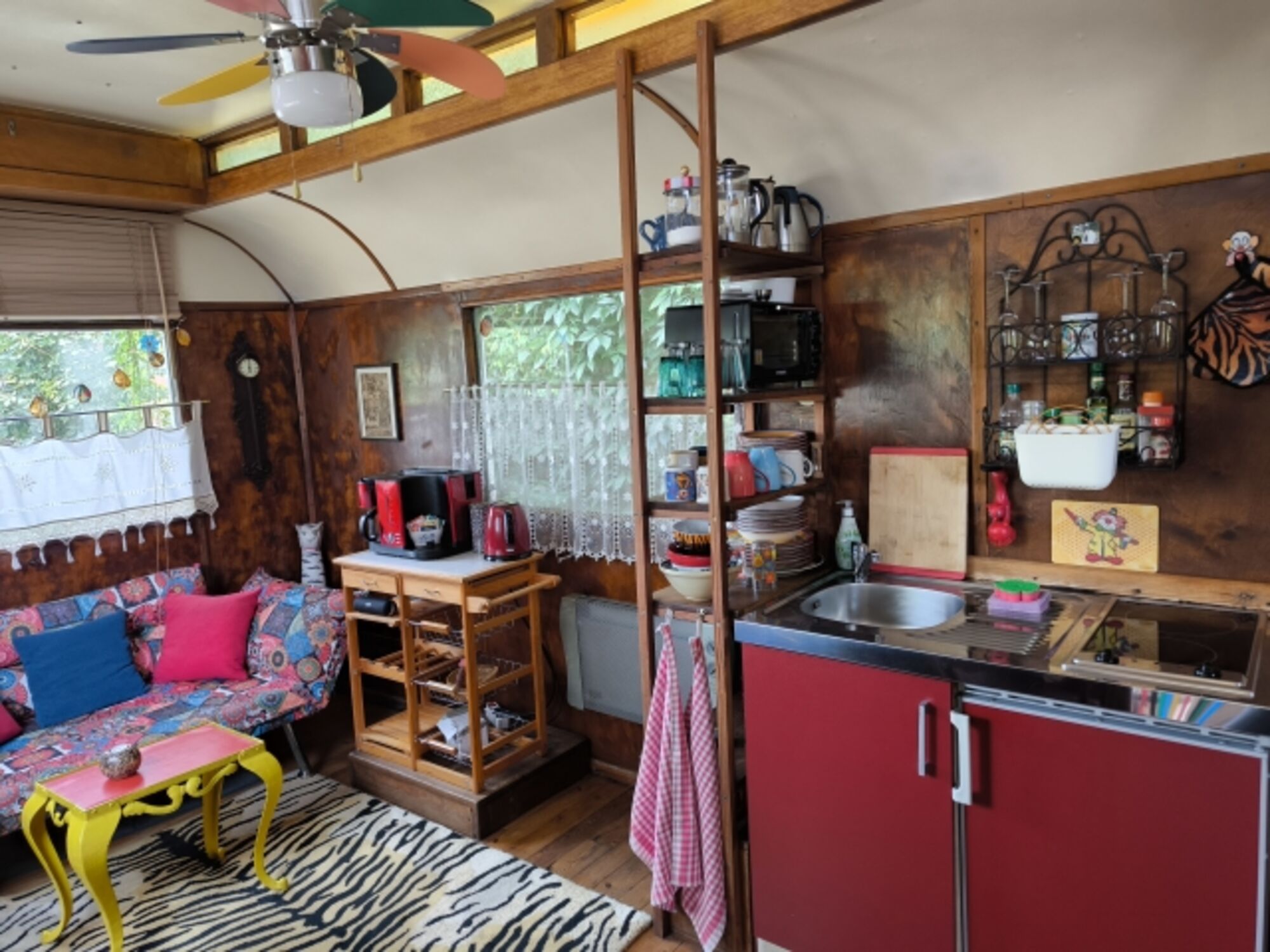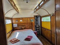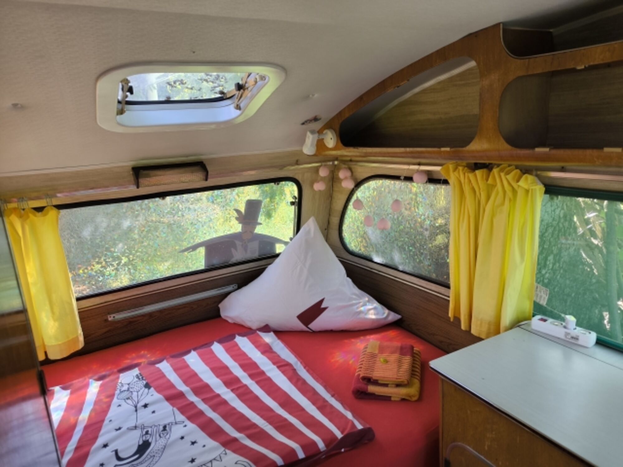 Abgetrennt durch die zweiflügelige Holz - Schiebetür mit Glasfenstern kommt man in den Schlafsalon mit einem Doppelbett. Rechts befindet sich ein Kleiderschrank mit Ablagen und Hängemöglichkeiten, ein Spiegel und der Durchgang zum Duschbad. Durch die vielen Fenster ist es im Inneren sehr hell und freundlich. Zusätzlichen Charme bekommt der Innenraum durch die Holzverkleidung, die noch aus dem Baujahr 1940 stammt und durch uns aufgearbeitet wurde.