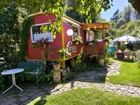 Mit der Anschaffung des nostalgischen Oberlicht - Zirkuswagen haben wir uns einen Traum erfüllt - 1940 von der Fa. Schumann erbaut, haben wir ihn direkt von Zirkusleuten erstanden (!), ihn wieder in den Originalzustand gebracht und zum Ferienhaus ausgebaut. Es handelt sich um einen ehemaligen Salonwagen mit Zwillingsbereifung und Holzbeplankung und trotz der knallroten Bemalung ist das Holz in einem guten Zustand. Die gesamte Wohnfläche beträgt 20 m² plus nochmal 5 m² für die überdachte Veranda mit zusätzlicher Sitzgelegenheit und natürlich der neu dazu gekommene Kinder - Circus - Caravan mit ca. 6 m², in dem aber auch Erwachsene schlafen können! (Doppelbett)