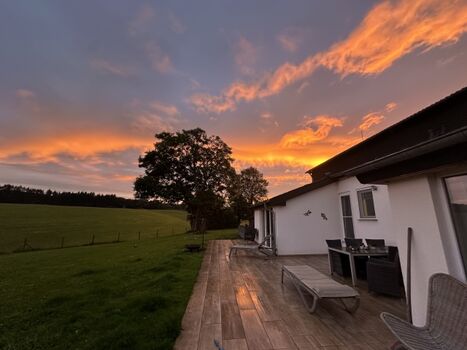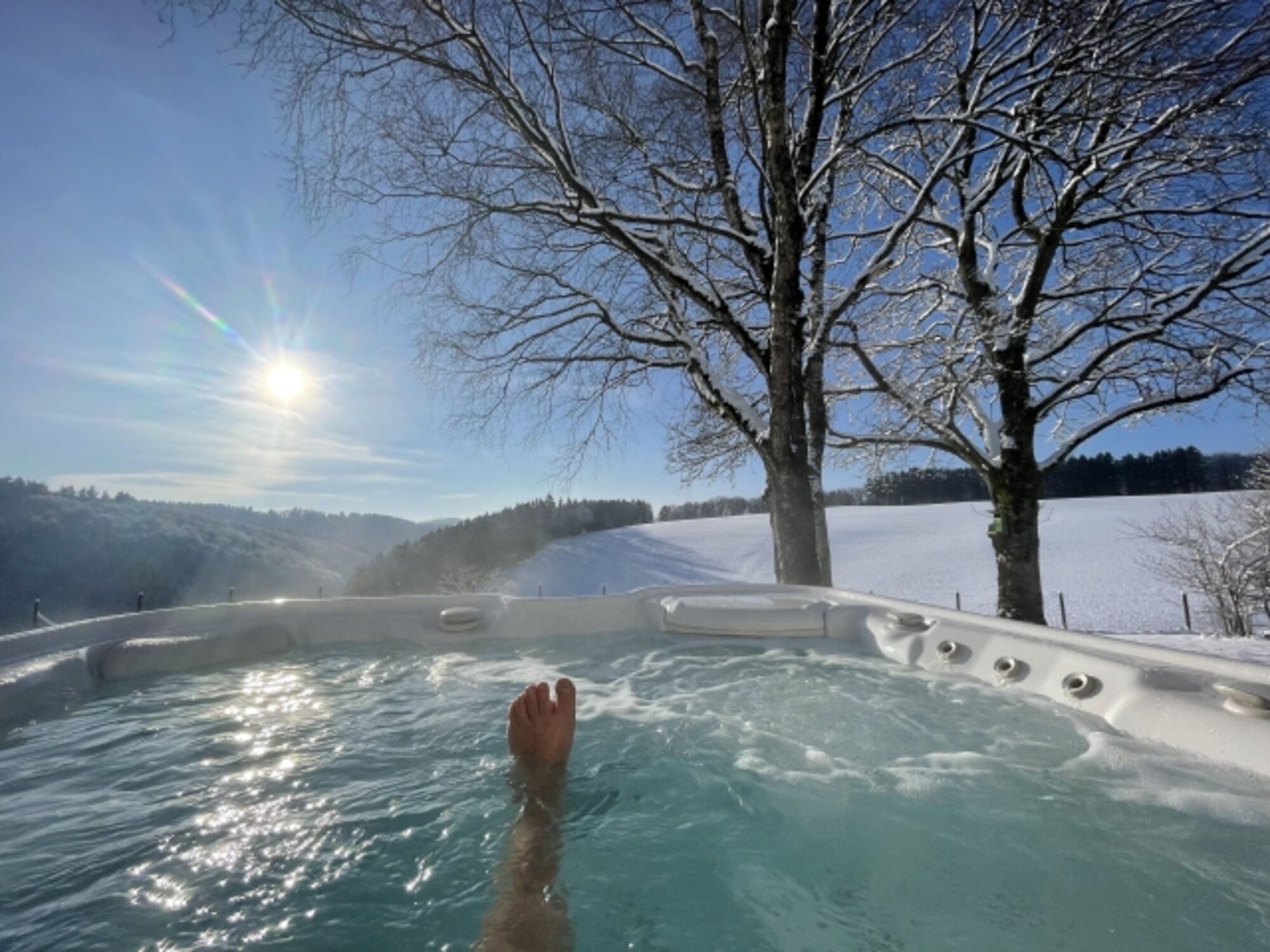 Unser 100 m² großes Ferienhaus Pusteblume im Vennchen mit 2 Schlafzimmern, Küche, 2 mal Dusche, separates WC, Wohnzimmer, Esszimmer und Ruheecke, mit schönem Panoramablick, Abstellraum, Raum mit Waschmaschine und Trockner, Parkplatz, 100qm große Sonnenterasse, 1100qm Garten, komplett eingezäunt mit 1,50m Zaunhöhe , in ruhiger Alleinlage mit Whirlpool.