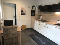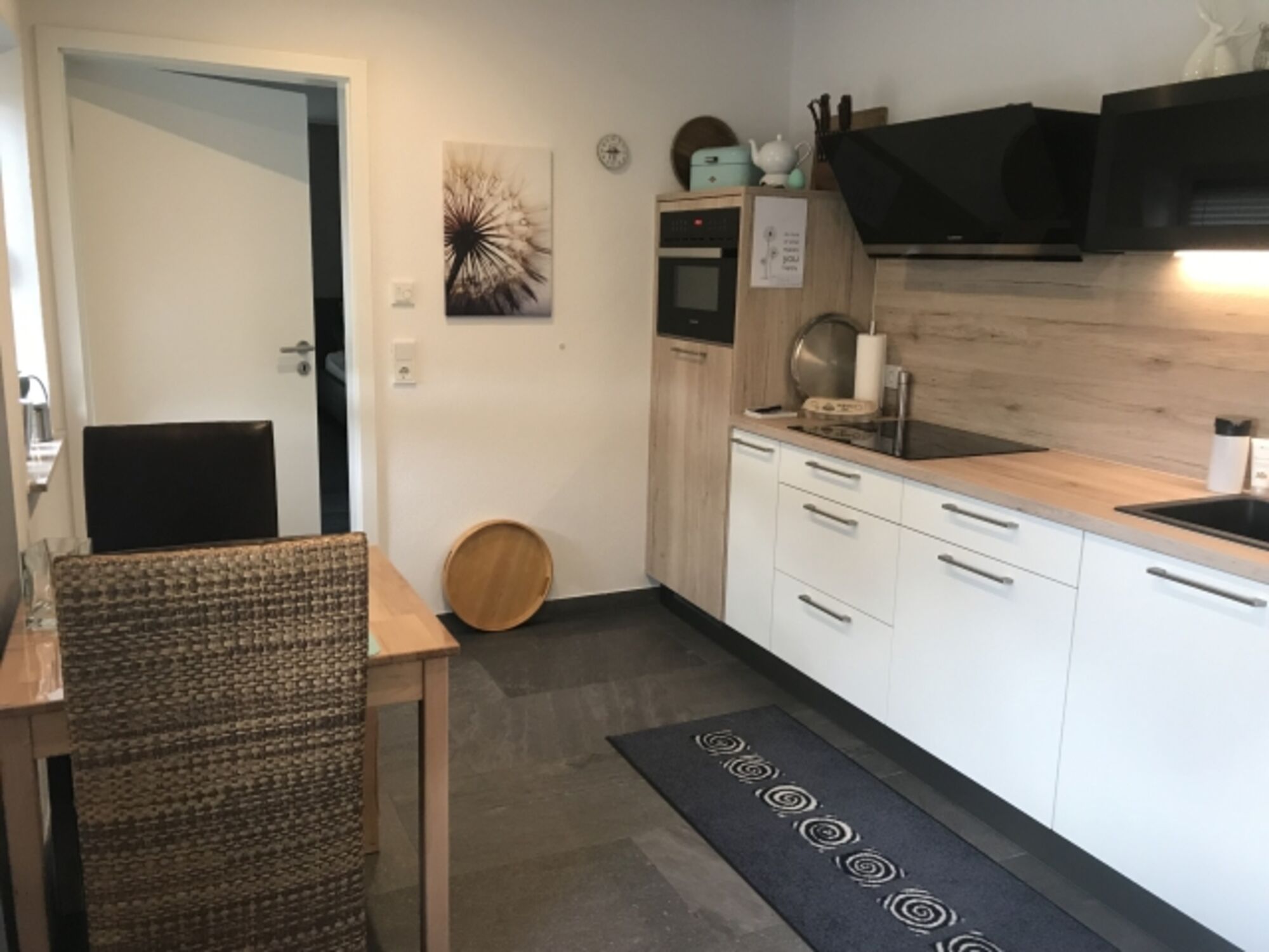 4-Platten Herd, Cerankochfeld, Dunstabzugshaube, Kühlschrank mit Gefrierfach, Senseo-Kaffeeautomat, Mixer, Korkenzieher / Flaschenöffner, Gewürze (Salz, Pfeffer, Zucker), Öl / Essig, Geschirrhandtücher, Mülltüten, Essplatz in der Küche
