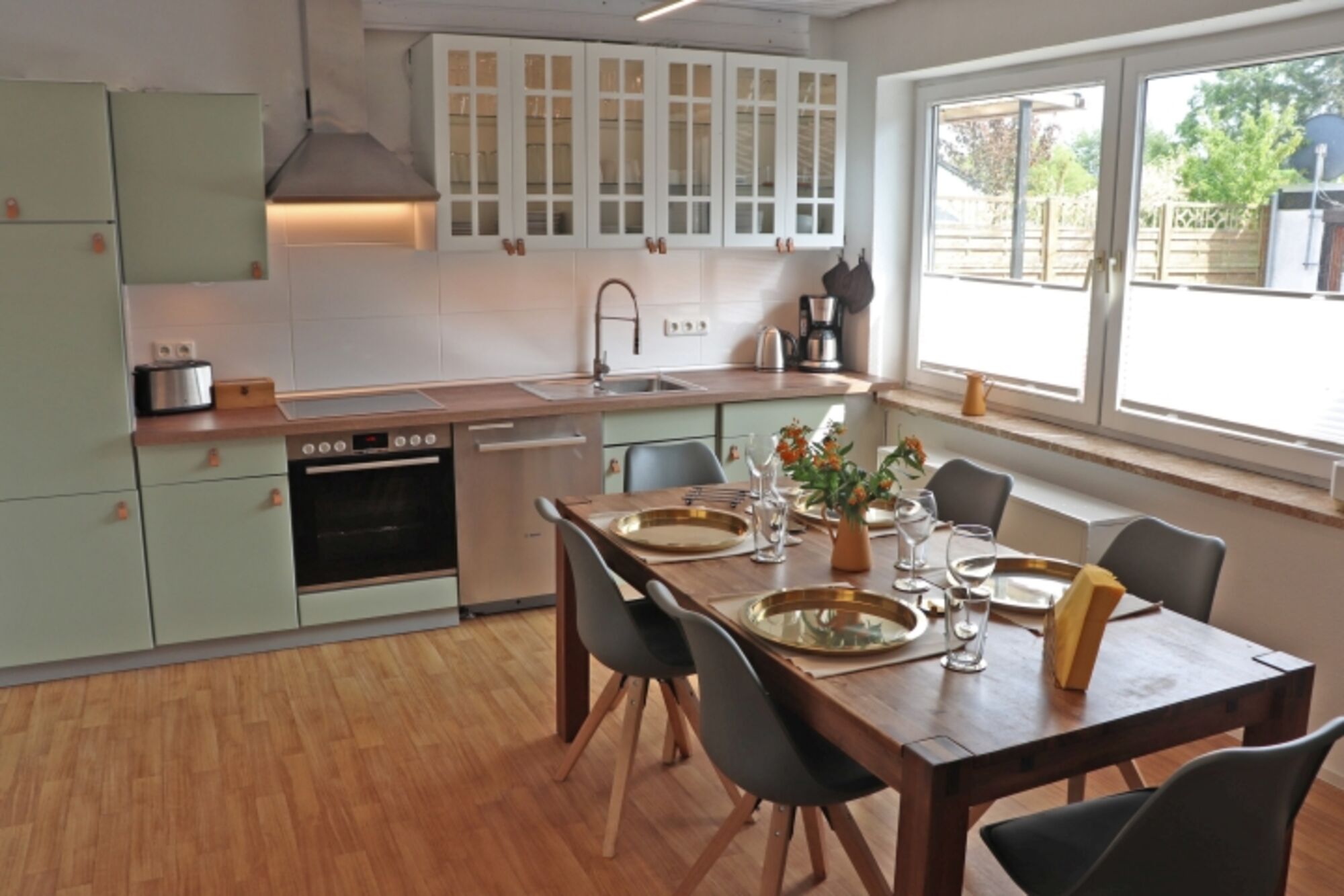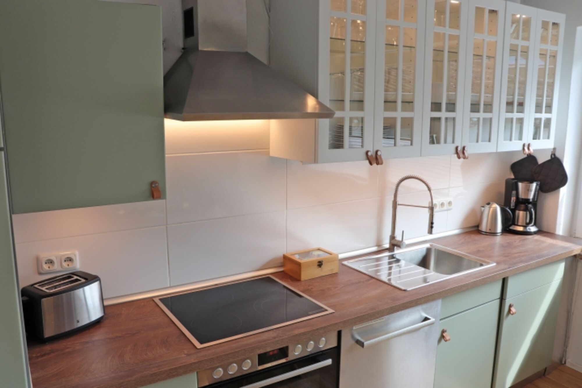 4-Platten Herd, Induktionsherd, Dunstabzugshaube, Kühlschrank mit Gefrierfach, Korkenzieher / Flaschenöffner, Gewürze (Salz, Pfeffer, Zucker), Öl / Essig, Mülltüten, Essplatz in der Küche