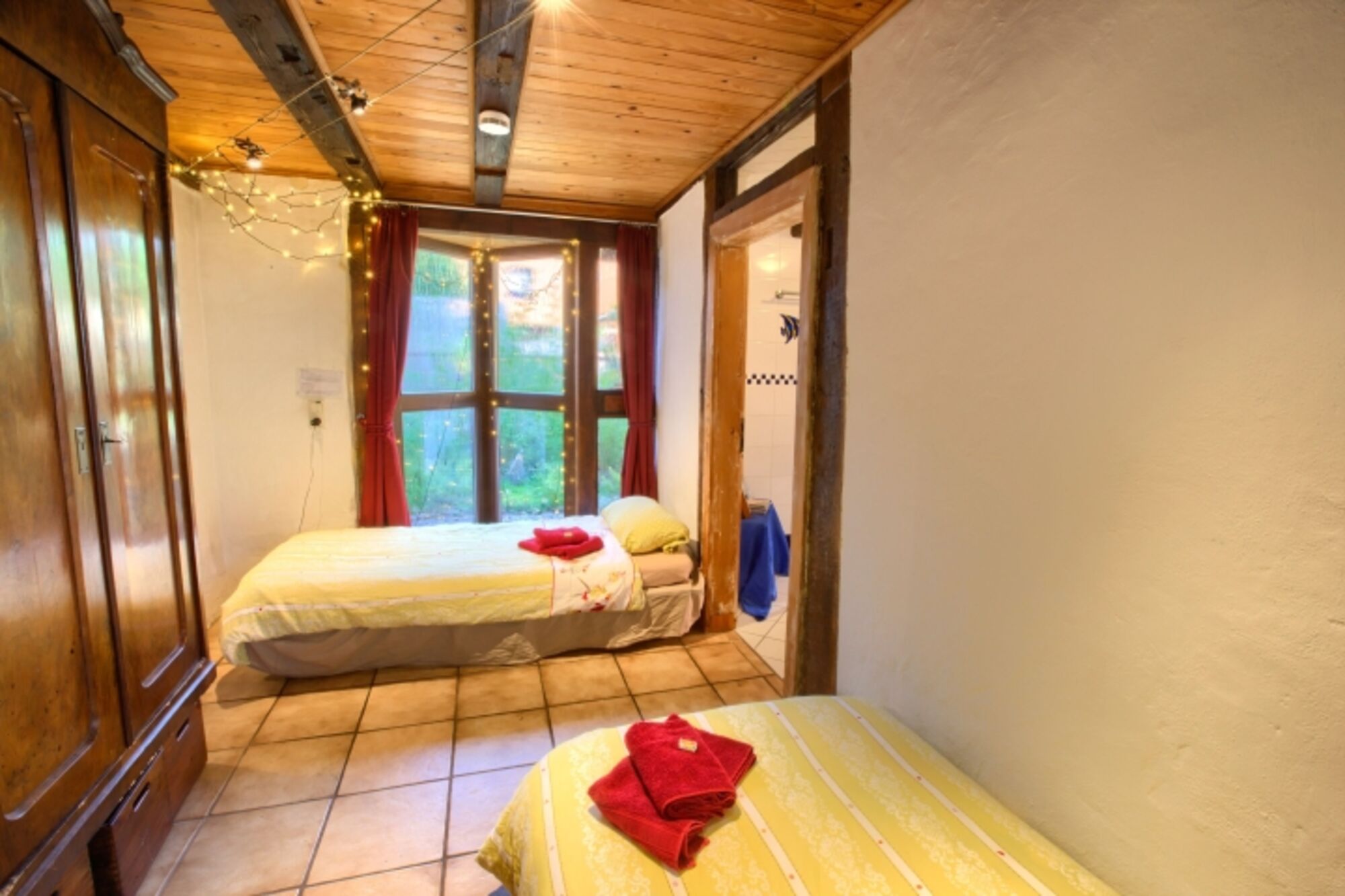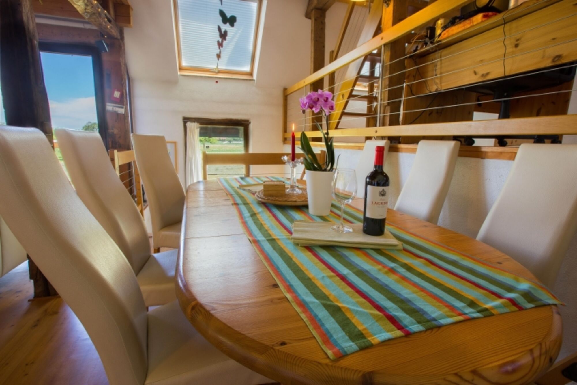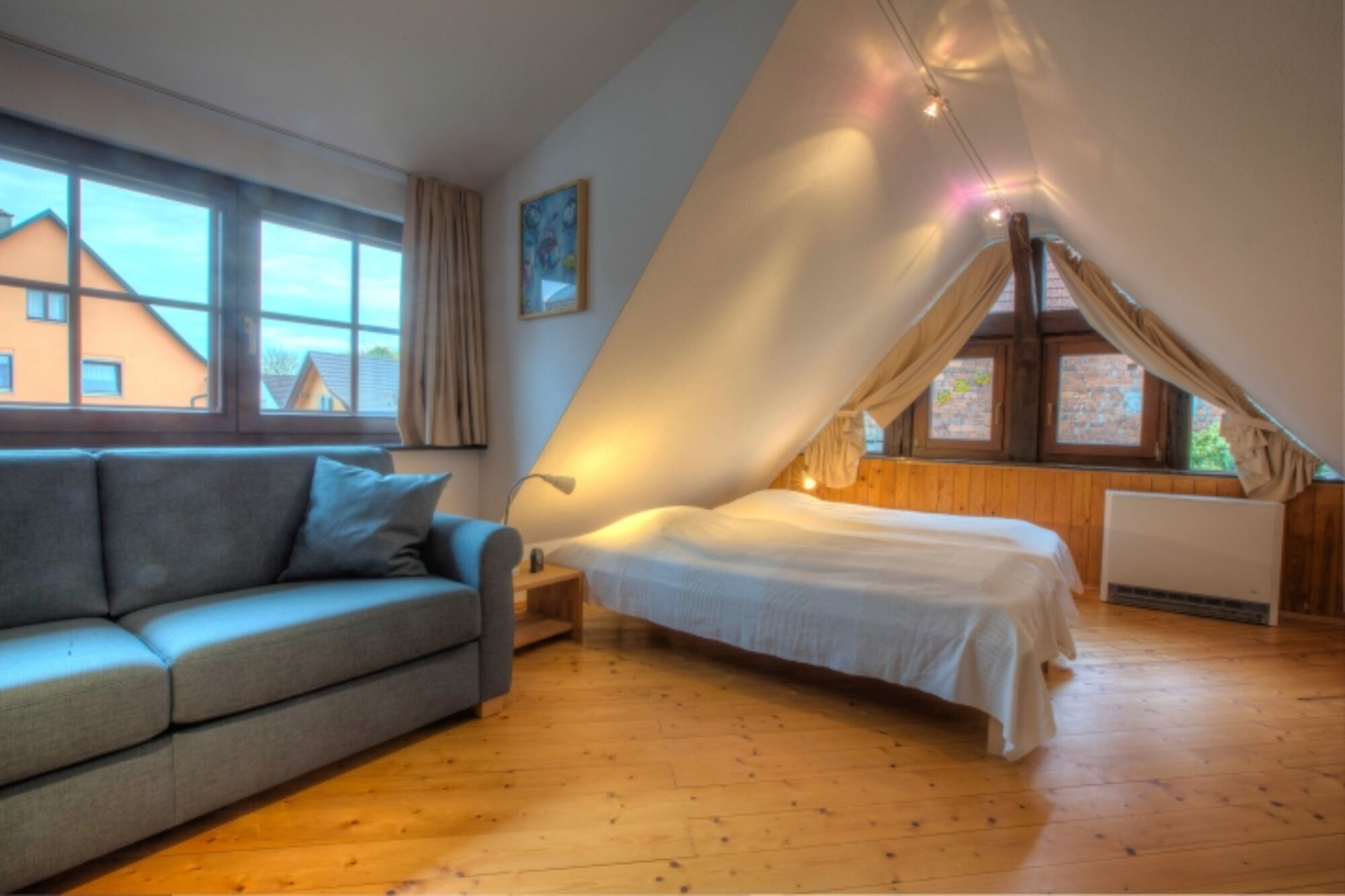 Das liebevoll renovierte Fachwerkhaus bietet Platz für bis zu 12 Personen und kombiniert historischen Charme mit modernem Komfort. Das lichtdurchflutete Wohnzimmer mit Kamin und Panoramafenster bietet eine herrliche Aussicht auf Wiesen, Bach und den Schwarzwald. Auf dem Balkon können Sie gesellige Grillabende genießen.