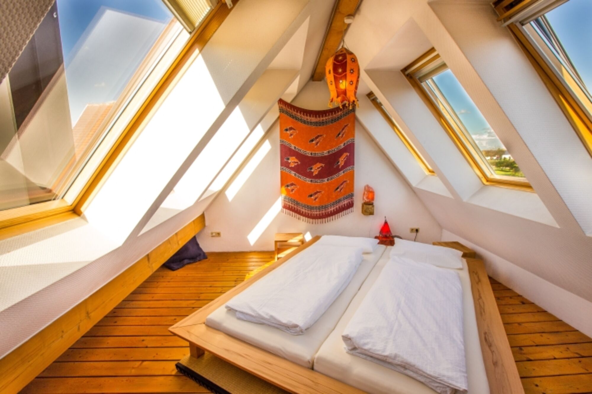 überlanges Futonbett (180 x 220 cm) mit Sternenblick in der Schlafgalerie. Klimaanlage. Doppelbett 1,80 x 2,00m
