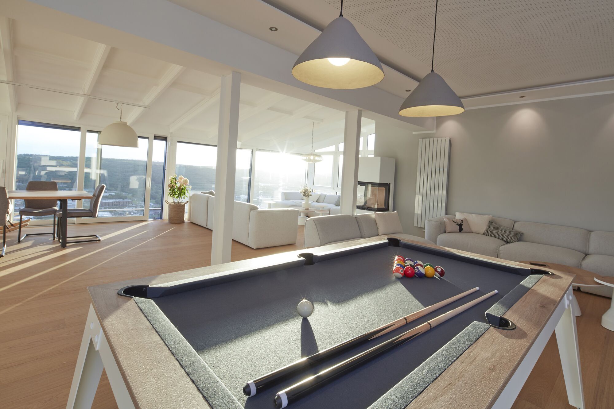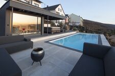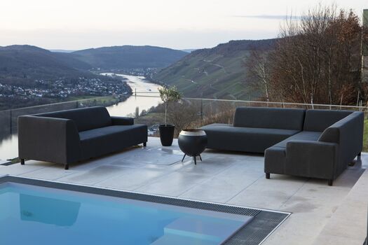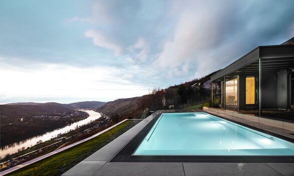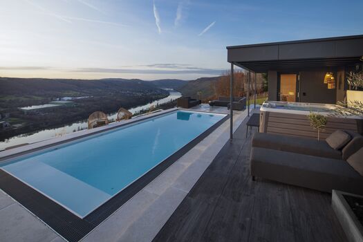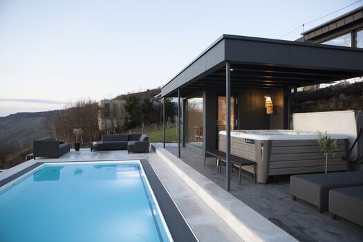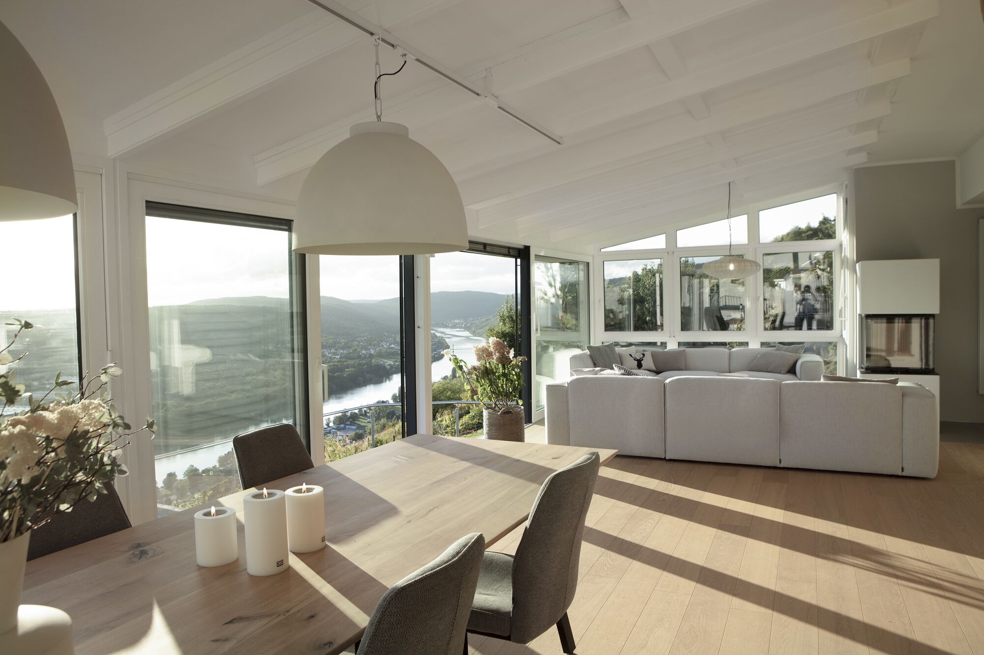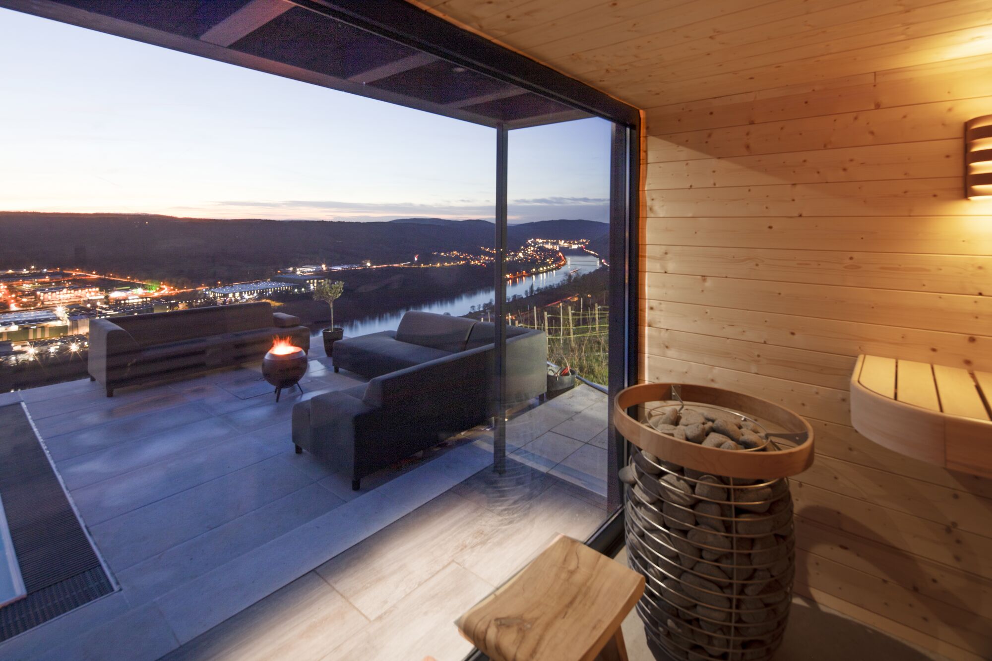 Der atemberaubende Blick über das Moseltal prägt das gesamte Haus. Große Panoramafenster, die Sauna und der Infinity-Pool eröffnen einzigartige Ausblicke in die Natur. Direkt von der Villa starten zahlreiche Wanderwege – ideal für ausgedehnte Spaziergänge mit dem Hund.