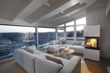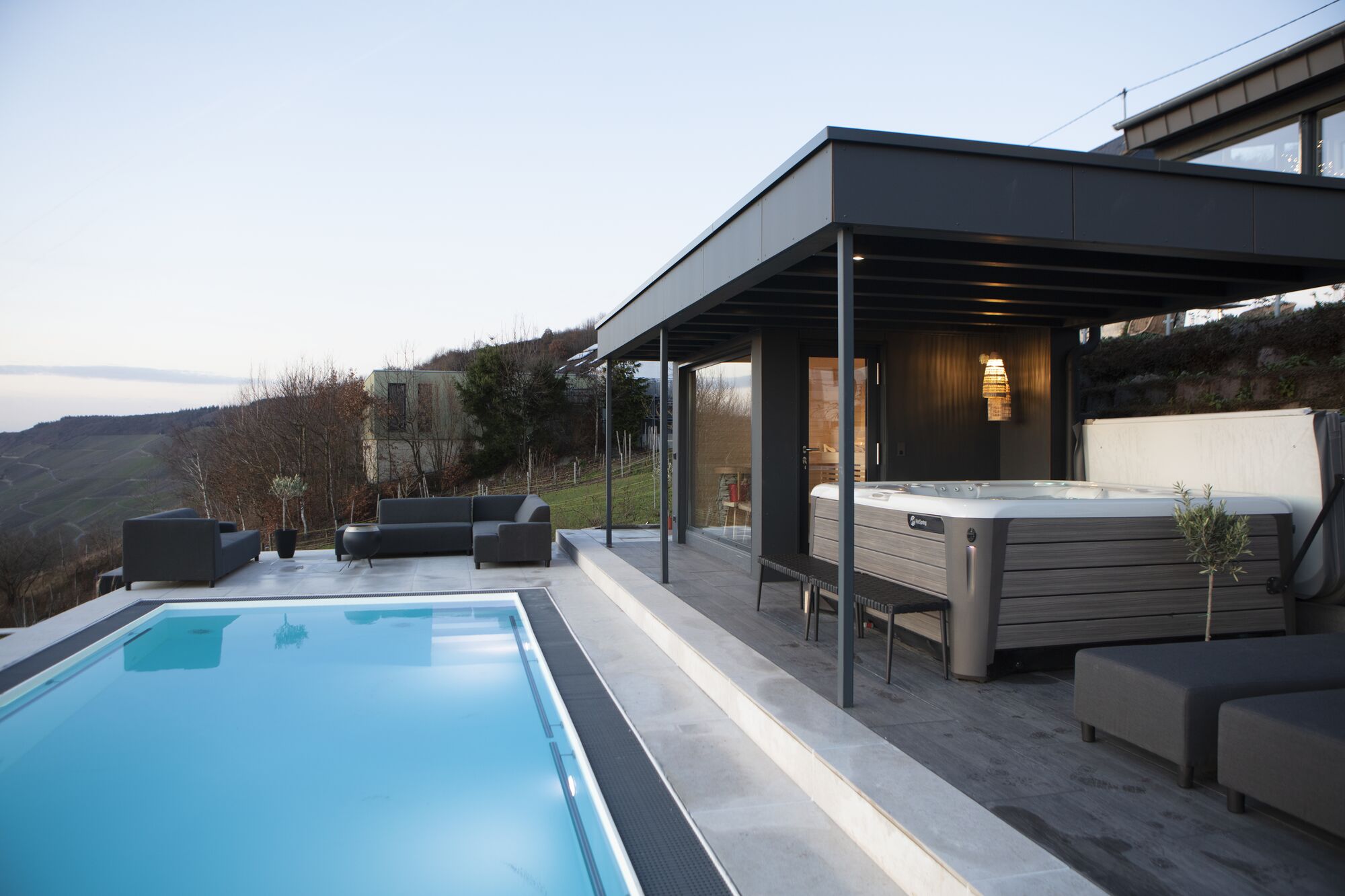 Für Entspannung zu jeder Jahreszeit sorgen Panoramasauna, überdachter Whirlpool (bis 40 °C) und ein Kamin mit Blick auf das Feuer.