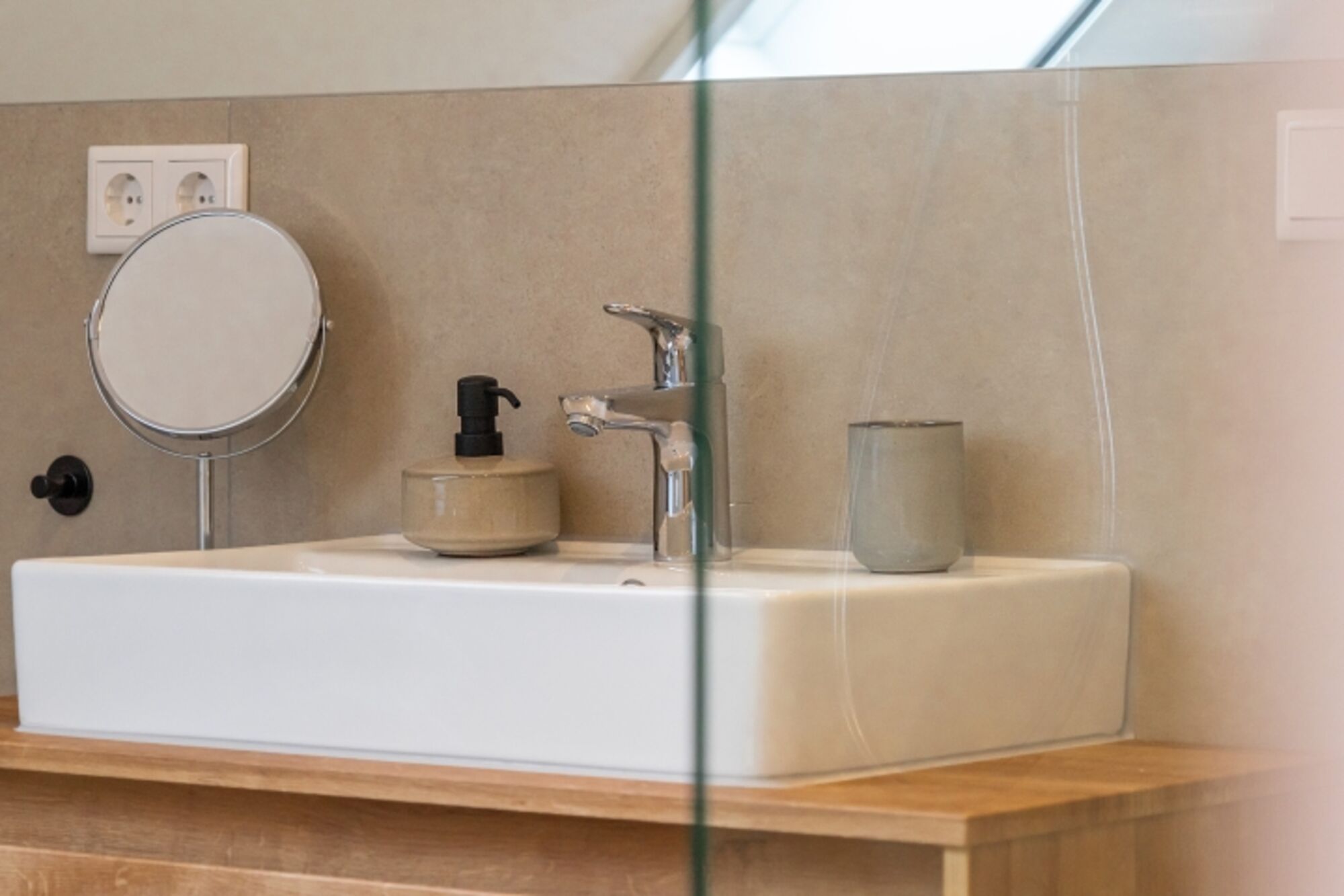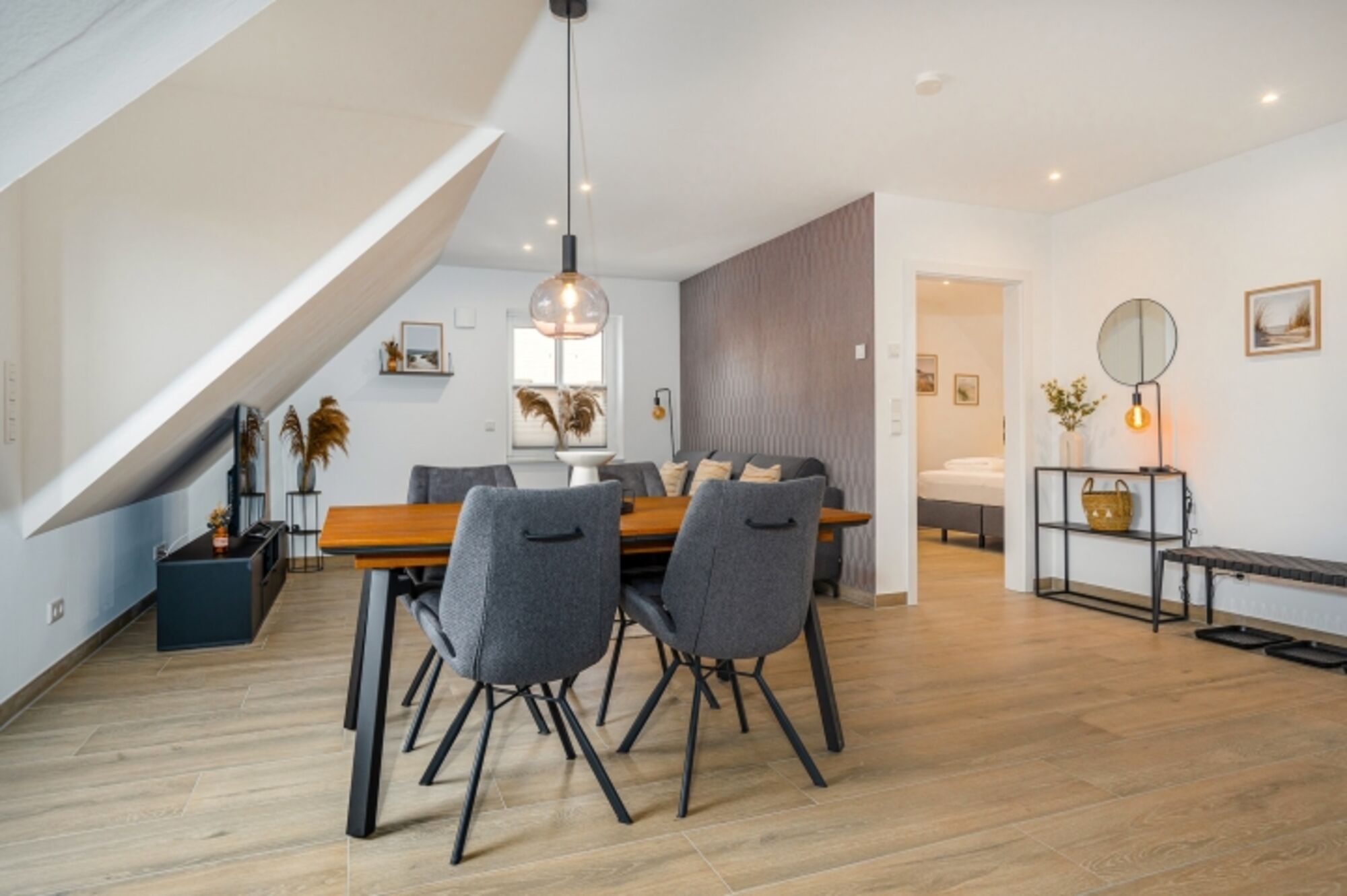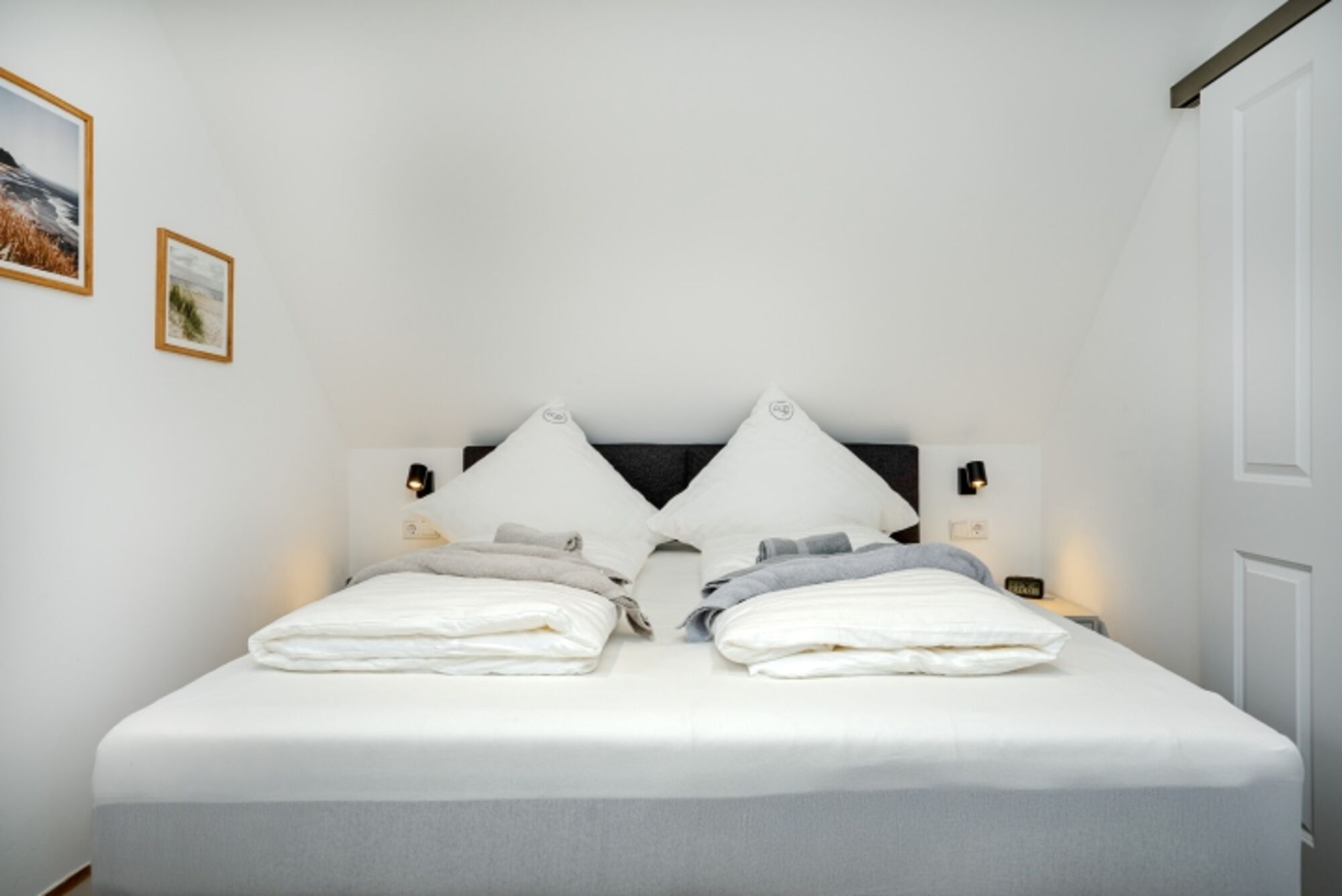 Die 70qm große Obergeschosswohnung "Vista 6" überzeugt mit einem offenen, modernen Wohn-Ess-Bereich und einer hochwertigen, großzügigen Einbauküche. Das Hauptschlafzimmer ist mit einem komfortablen Boxspringbett ausgestattet und verfügt über ein Badezimmer en Suite mit ebenerdiger Dusche, Waschmaschine und Fenster. Ein zweites Tageslichtbad mit Dusche bietet zusätzlichen Komfort für den gemeinsamen Urlaub mit Freunden oder der Familie. Im ausgebauten Spitzboden befindet sich ein zweites Schlafzimmer mit zwei Einzelbetten, das außerdem mit einem gemütlichen Lesesessel zum Entspannen einlädt. Ein eigener Parkplatz sowie eine Abstellmöglichkeit für Ihre Fahrräder sind selbstverständlich Bestandteil dieser Wohnung.