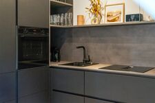 Cerankochfeld, Dunstabzugshaube, Kühlschrank mit Gefrierfach, Korkenzieher / Flaschenöffner, Essplatz in der Küche