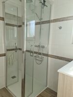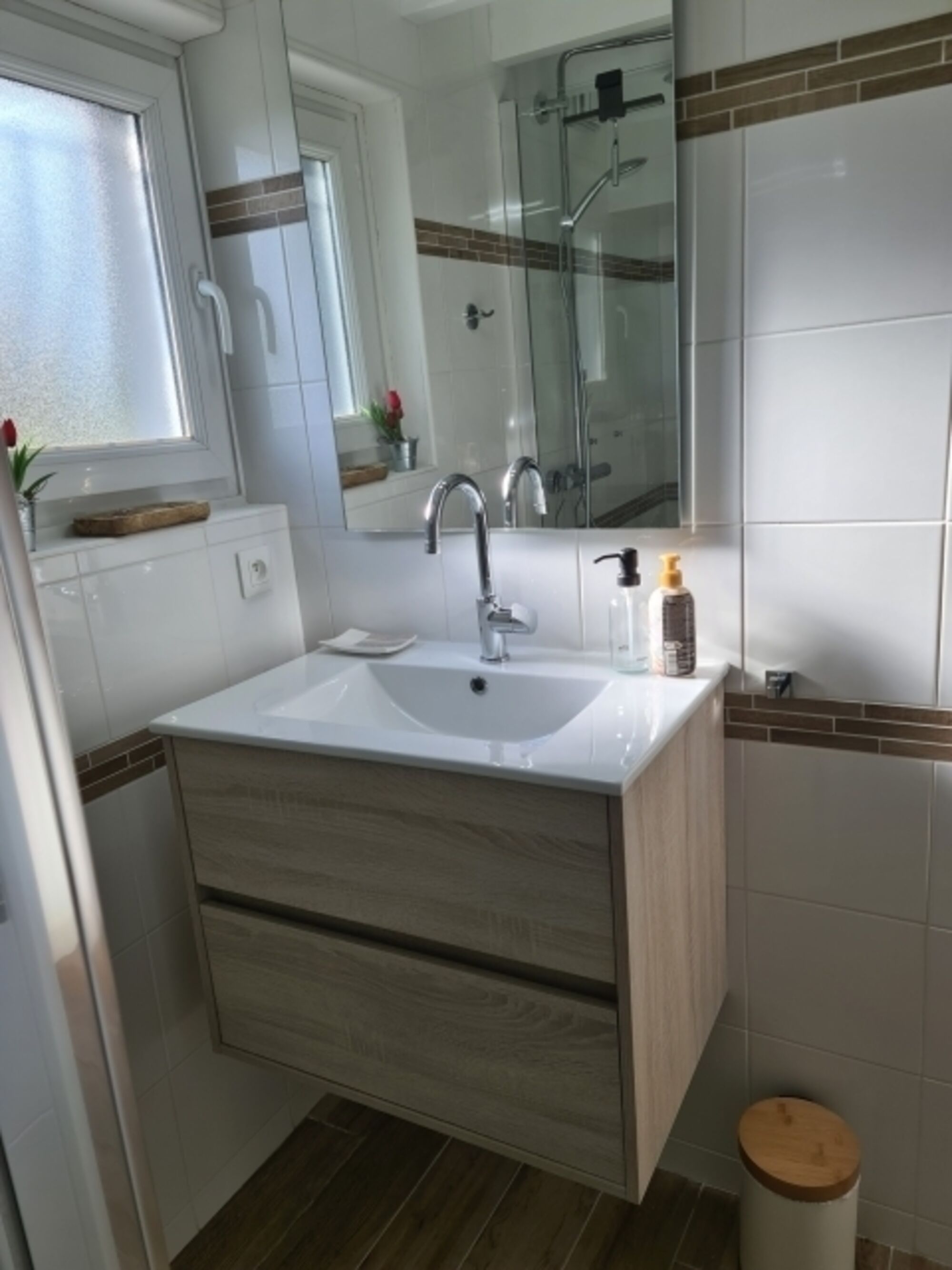 Im neuen Badezimmer mit Fenster gibt es eine ebenerdige Dusche mit einem integriertem Duschhocker, und ein neues WC ist in einem extra Raum - ebenfalls mit Fenster.