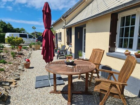 Sonnenschein genießen Sie auf der Terrasse in unserem großen, eingezäunten Garten in dem viele Obststräucher und Obstbäume wachsen.