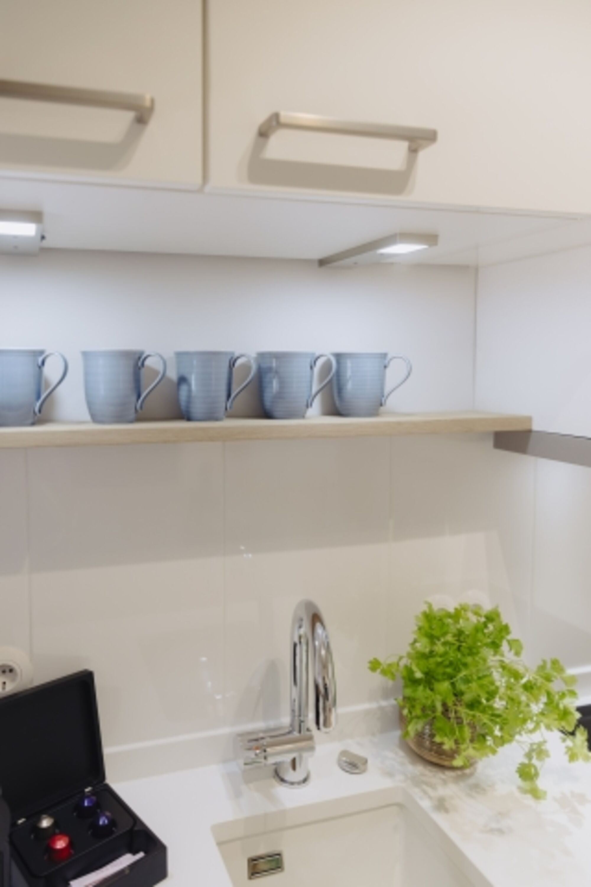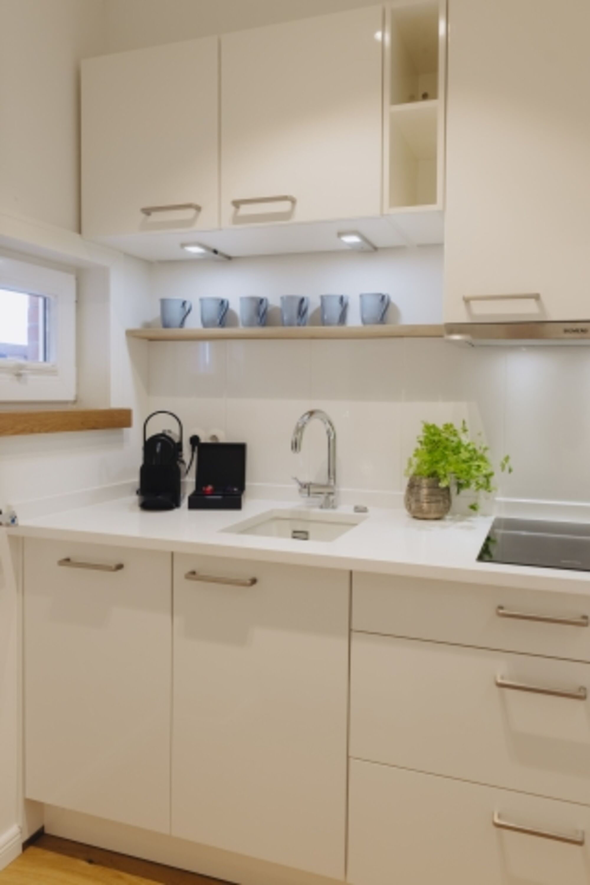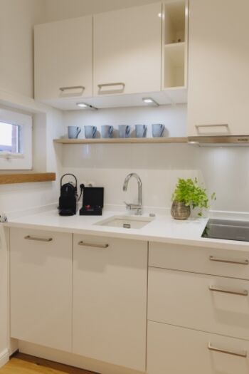 2-Platten Herd, Dunstabzugshaube, Kühlschrank mit Gefrierfach, Nespresso-Automat, Geschirrhandtücher, Mülltüten