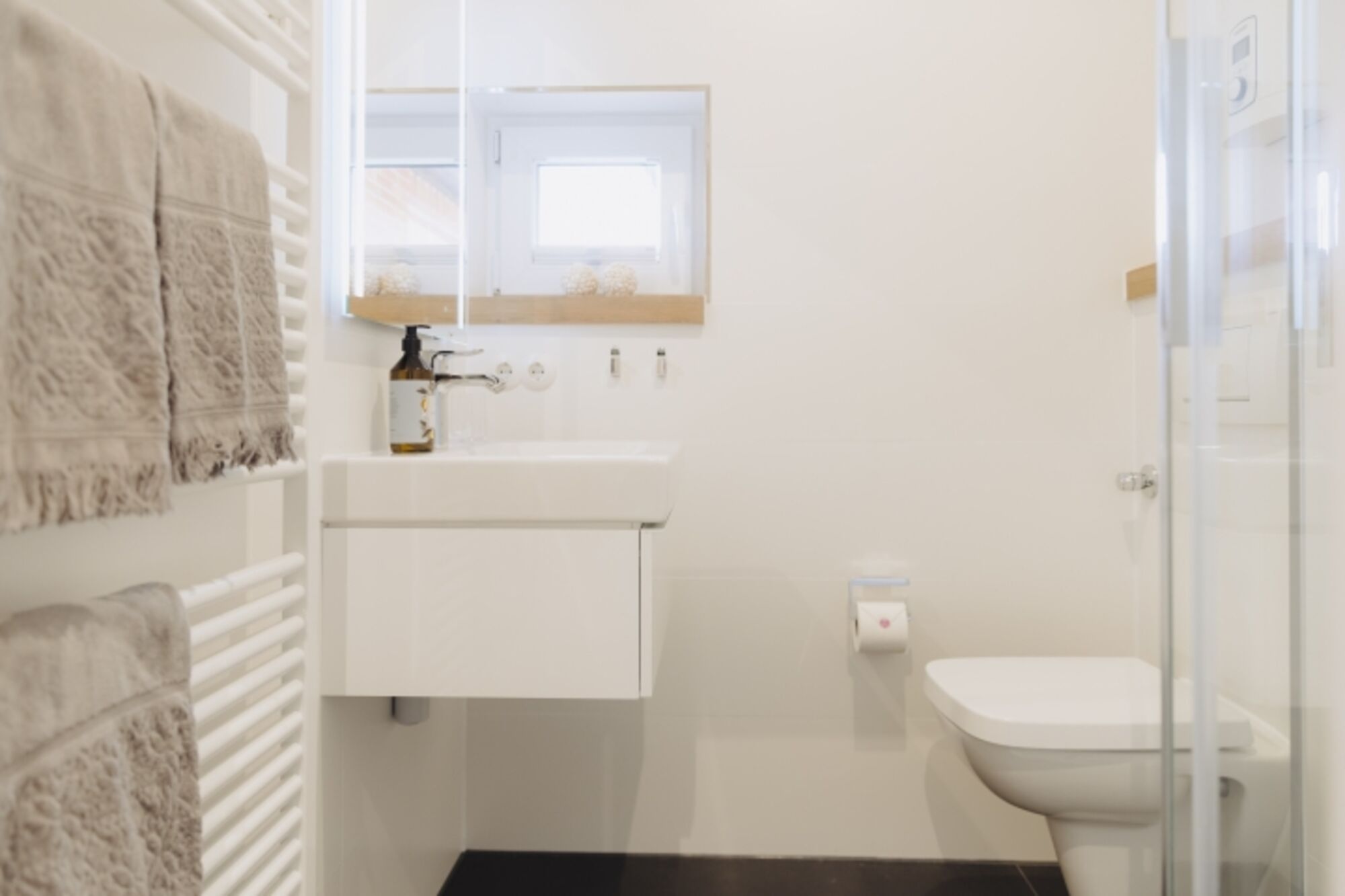Das moderne Duschbadezimmer mit Fenster bietet Komfort für Ihren Aufenthalt.