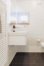 Waschbecken, Spiegel, Fenster im Bad