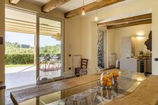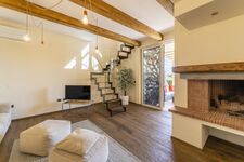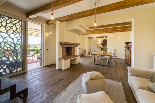 Voll ausgestattete Küche, Induktionskochfeld, Kühl-/Gefrierschrank, Inseleinheit, Stühle, Esstisch und Stühle, Beistelltisch, Kamin, Sofa, Smart-TV, Treppe zum ersten Stock, Klimaanlage, Fenstertüren zur Terrasse, Terrasse mit Esstisch und Stühle, Wohnmöbel für den Außenbereich.