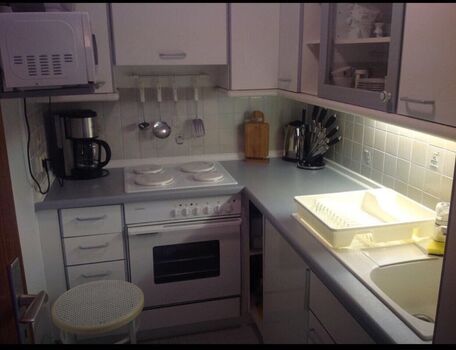 4-Platten Herd, Dunstabzugshaube, Kühlschrank mit Gefrierfach, Korkenzieher / Flaschenöffner, Geschirrhandtücher
