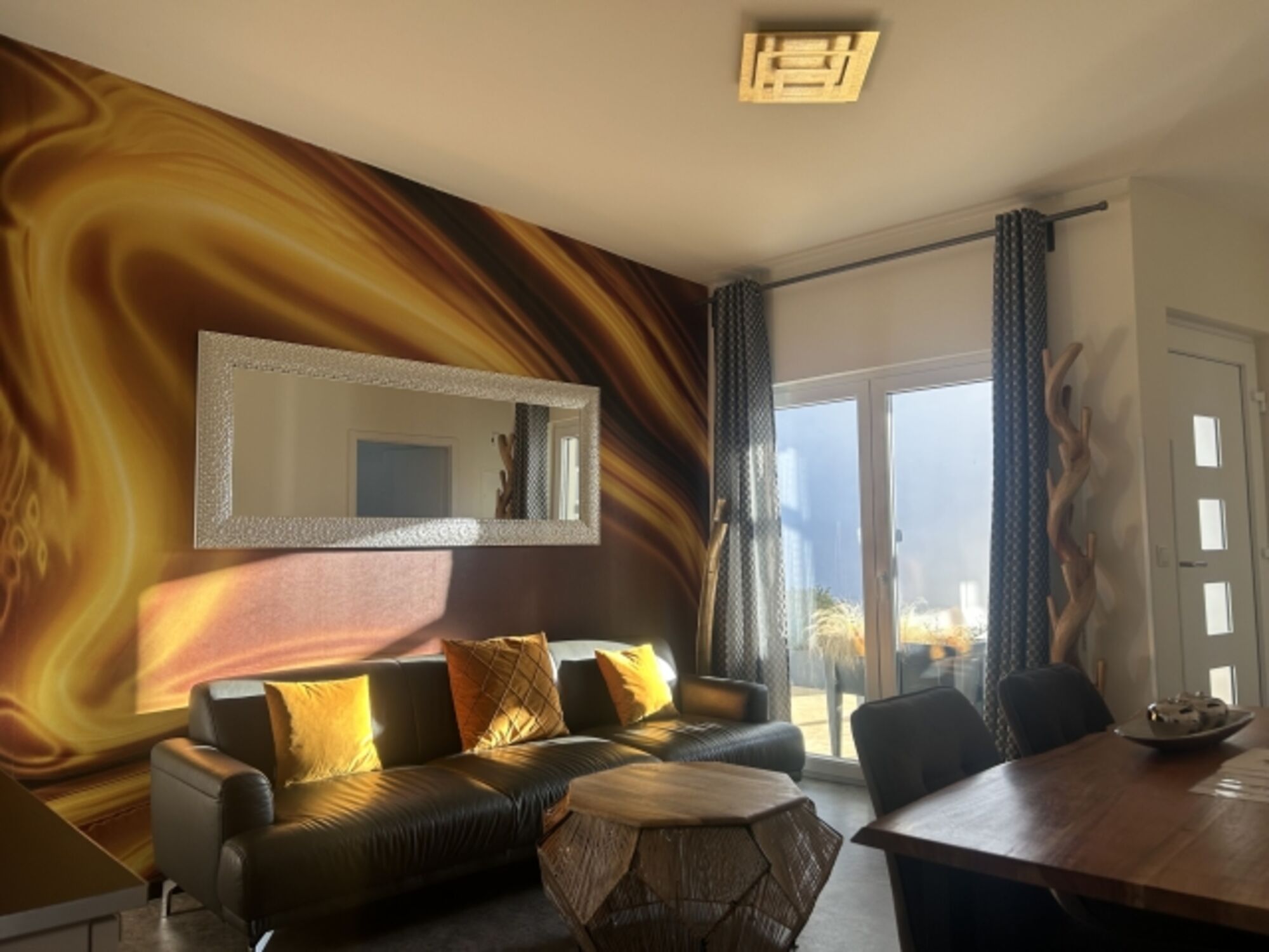 • ein modernes Wohnzimmer mit Couch, Esstisch und Flachbildschirmfernseher sowie eine sehr gut eingerichtete Küchenzeile mit Esstisch, Toaster, Kaffeemaschine, Wasserkocher, ein Herd mit 4 Cerankochplatten und Backofen, Kühlschrank mit Eisfach, Geschirrspüler, diversen Küchenutensilien