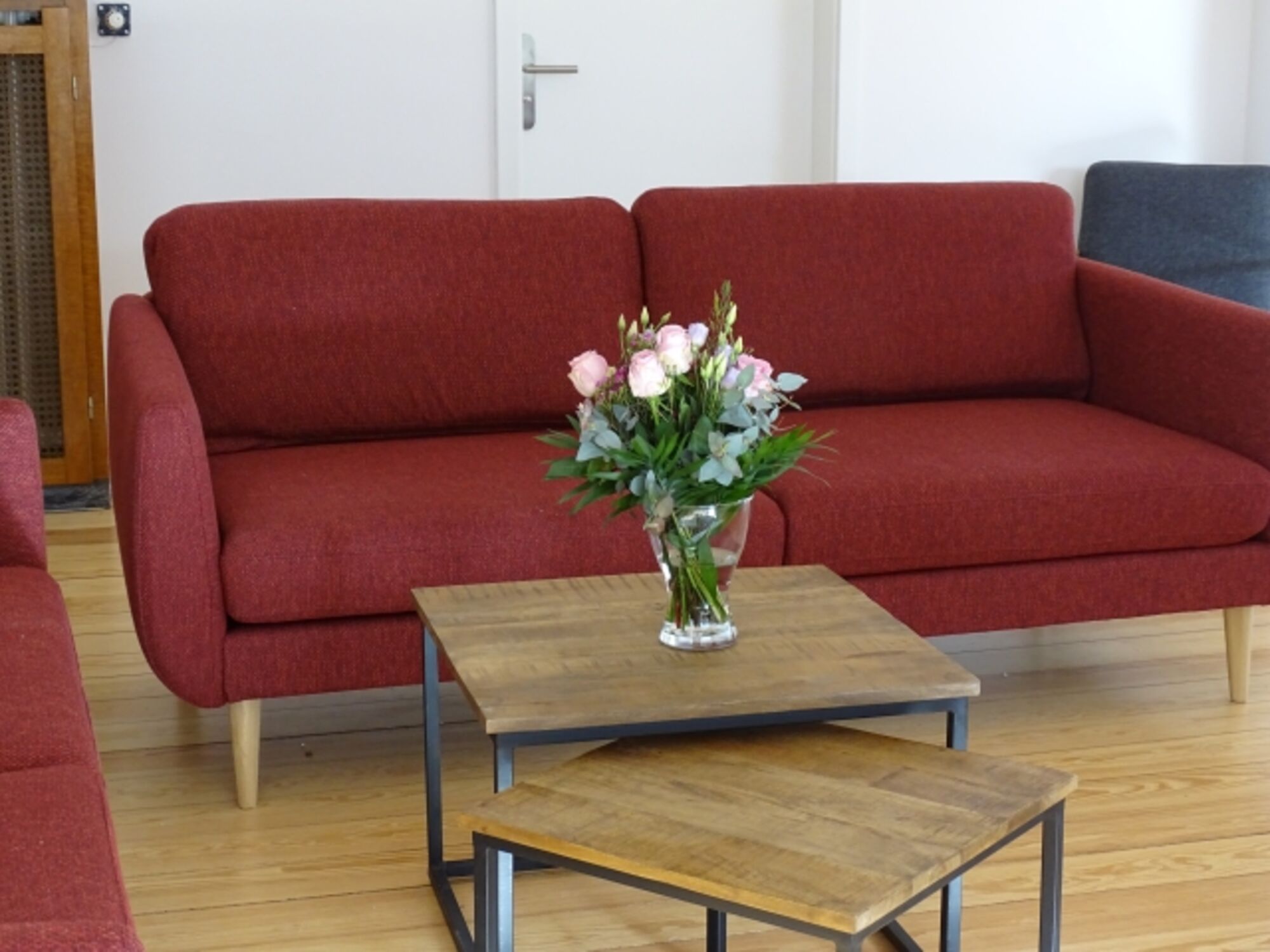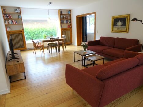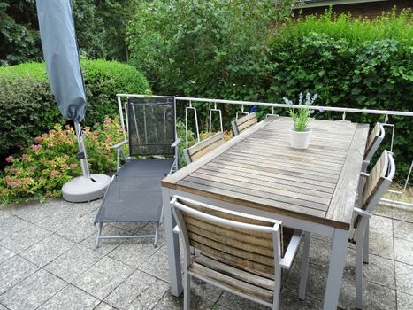 Die große möblierte Terrasse erreichen Sie bequem über das Wohnzimmer um in dem angrenzenden Garten die Sonne zu genießen.