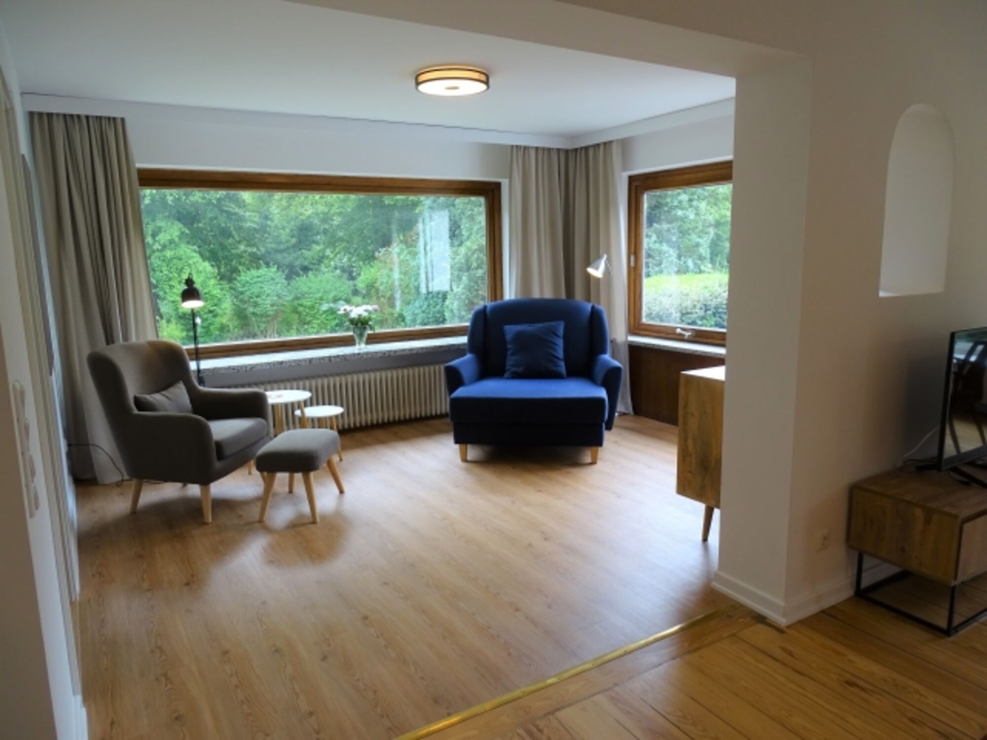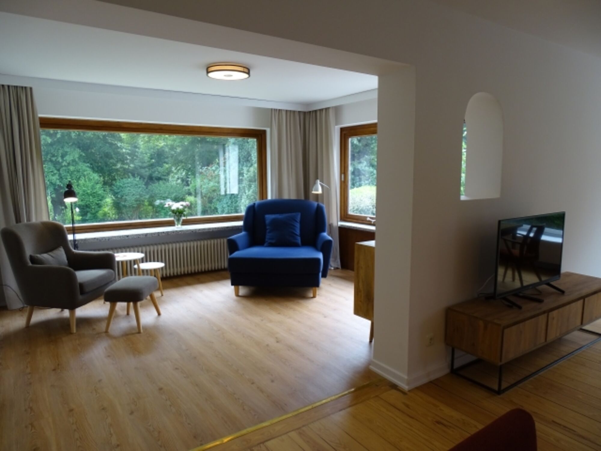 Die Ferienwohnung verfügt über 3 Zimmer, unterteilt in ein lichtdurchflutetes Wohnzimmer mit 2 Couchen, TV und Esstisch mit Bestuhlung. In dem angrenzenden Entspannungszimmer warten 2 gemütliche Ohrensessel auf Sie. In den 2 Schlafzimmern befinden sich je ein Boxspringbett ( 1,80 m x 2,00 m ), ein Kleiderschrank sowie ein TV.