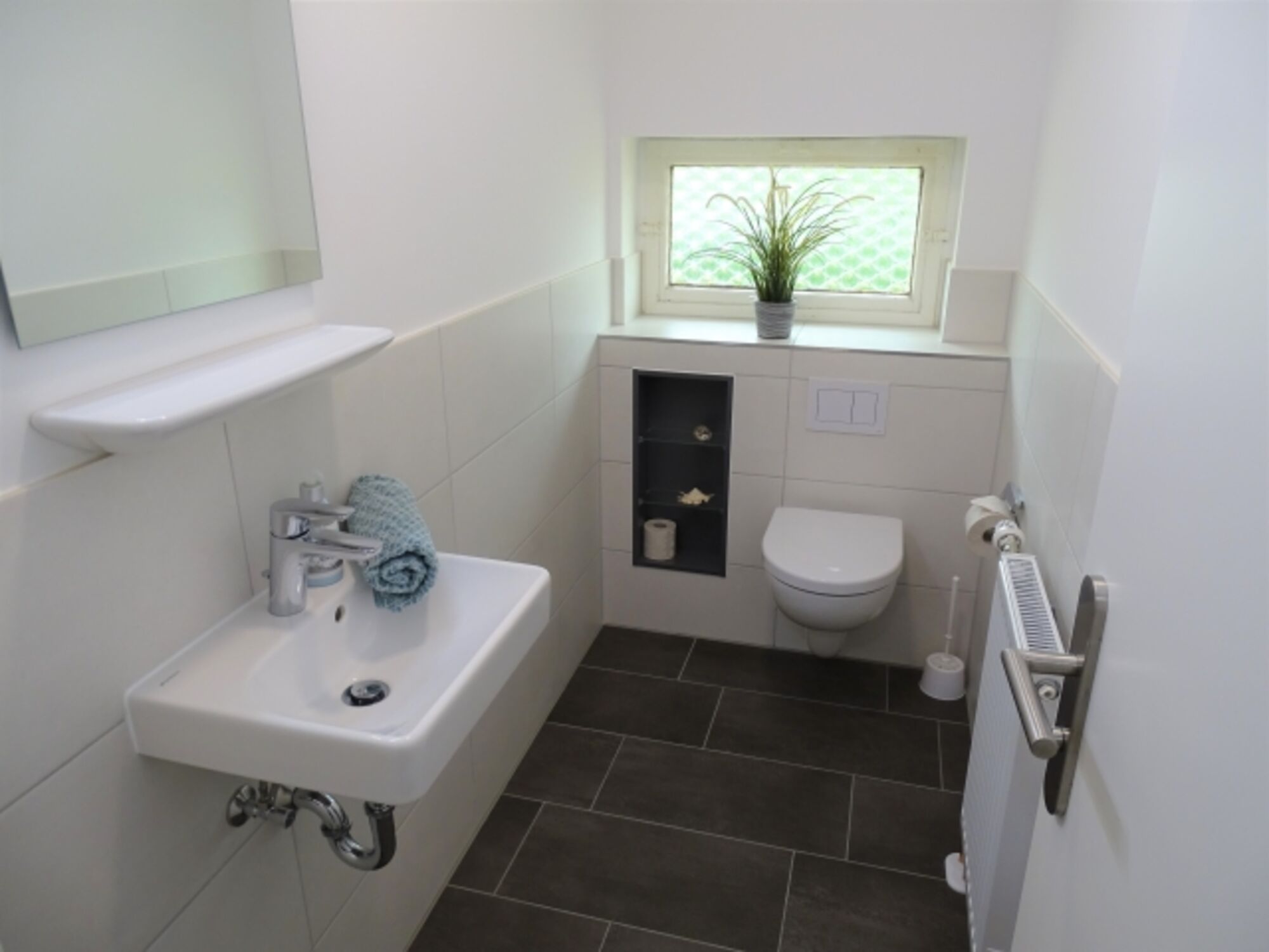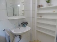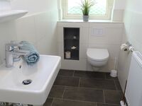 Das geräumige Bad verfügt über eine Dusche und Handwaschbecken, das WC befindet sich separat.
