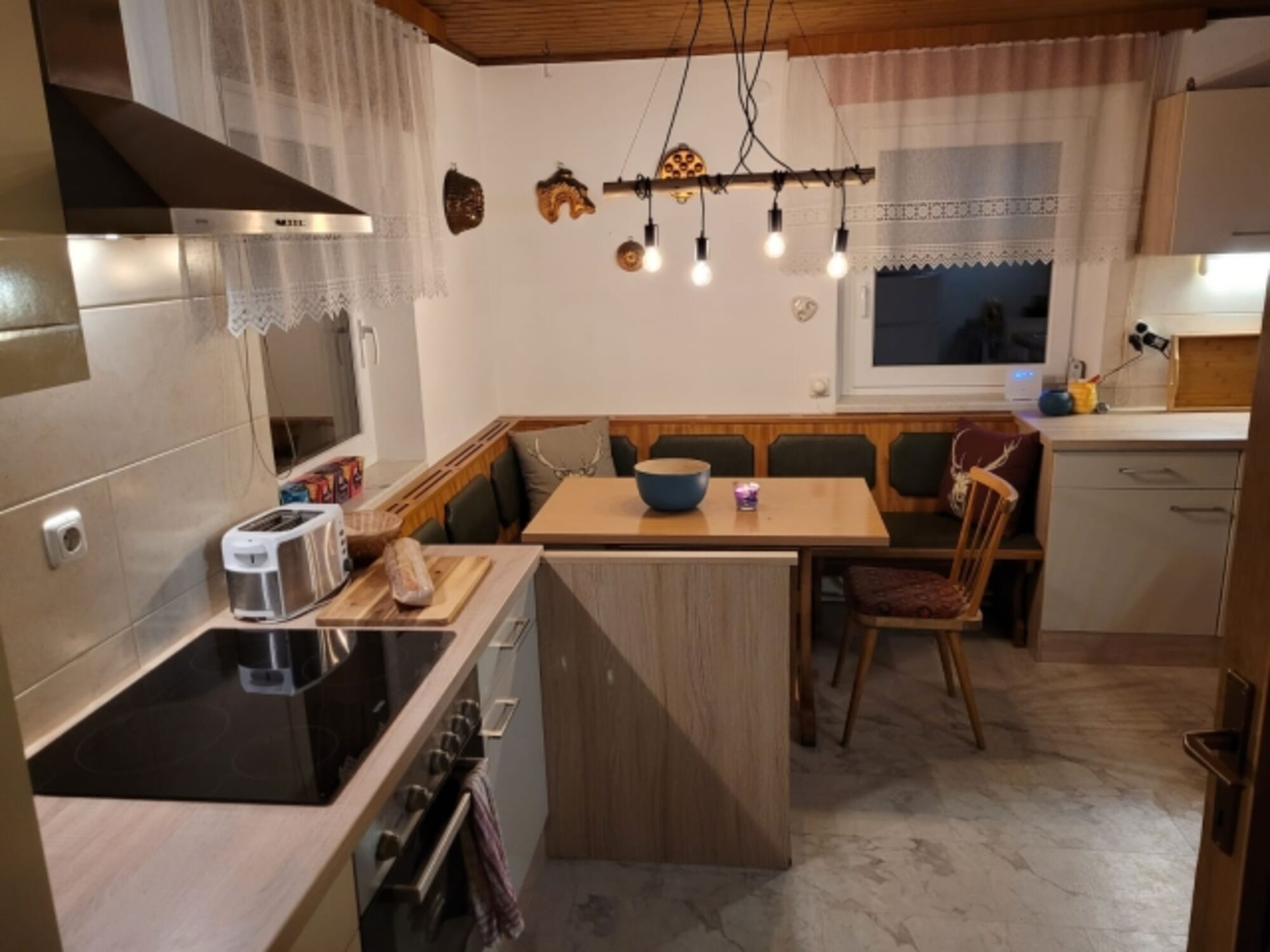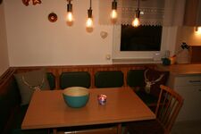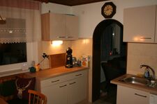 4-Platten Herd, Cerankochfeld, Dunstabzugshaube, Kühlschrank mit Gefrierfach, Senseo-Kaffeeautomat, Eierkocher, Mixer, Korkenzieher / Flaschenöffner, Gewürze (Salz, Pfeffer, Zucker), Öl / Essig, Geschirrhandtücher, Mülltüten, Essplatz in der Küche