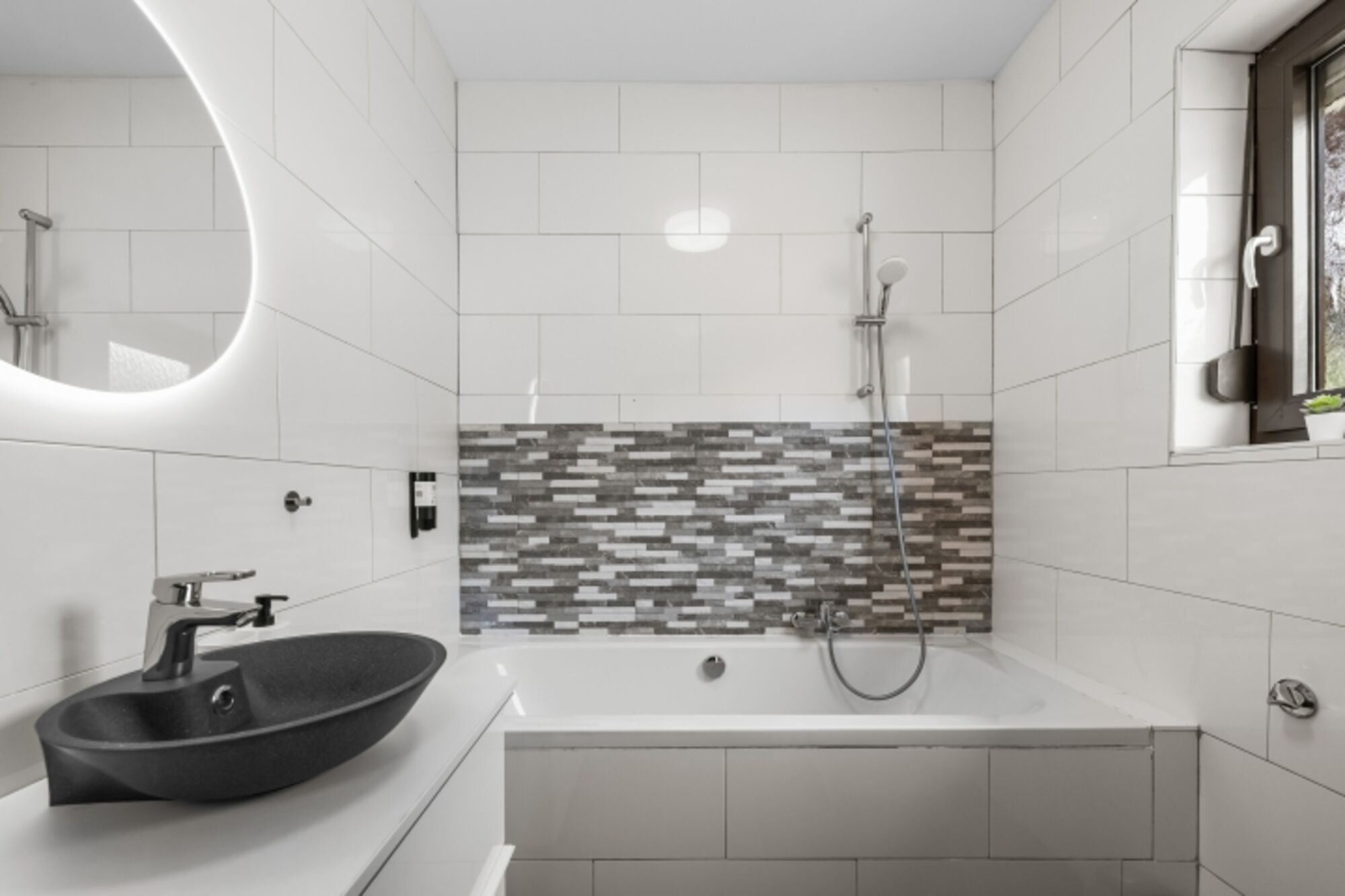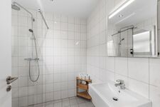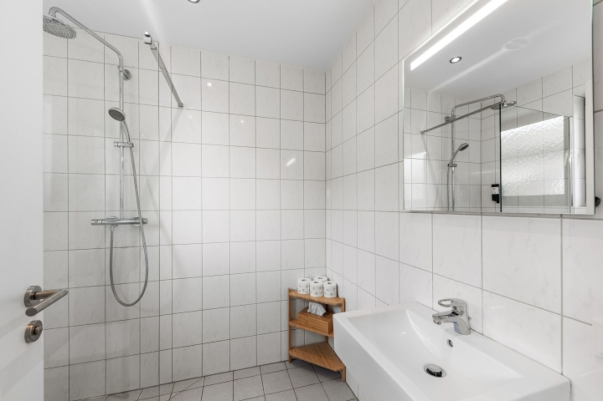 Die barrierefreie Dusche bietet ausreichend Platz für ein schnelles Frisch machen nach einem sportlichen Tag. Waschbecken, Kosmetiktücher, Spiegel, Fenster im Bad