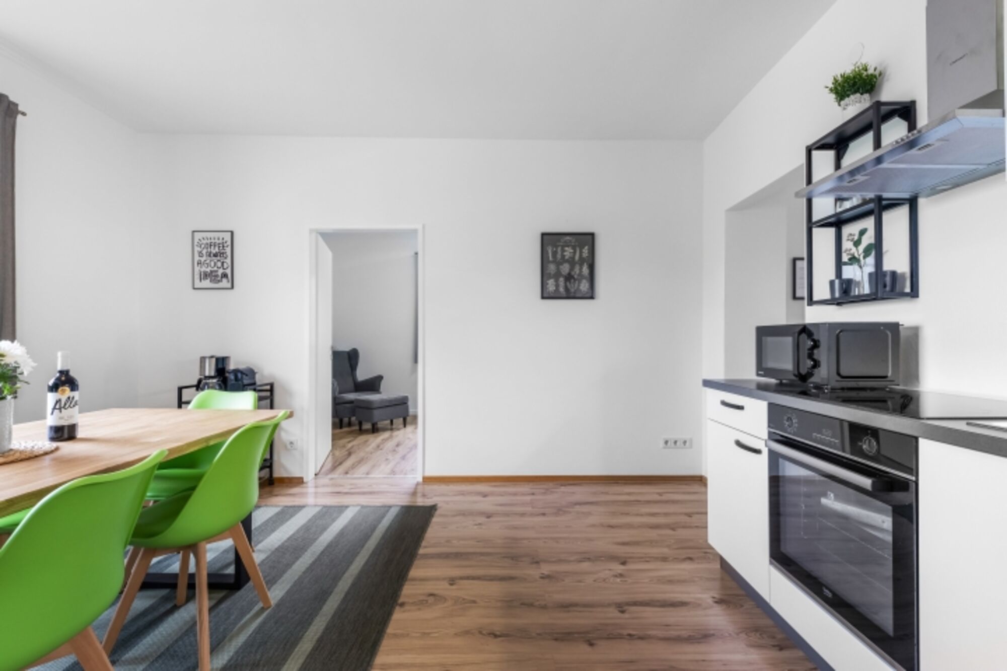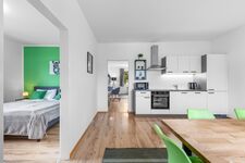 Das Apartment verfügt über zwei Schlafzimmer mit bequemen Kingsize-Betten und eine Schlafcouch im Wohnzimmer mit 140x200cm – perfekt für bis zu sechs Personen. In der voll ausgestatteten Küche mit Geschirrspüler, NESPRESSO- und Filterkaffeemaschine kannst du deine Lieblingsgerichte zubereiten. Der großzügige Wohnbereich lädt mit seinen zwei Sitzecken, einem 50-Zoll-Smart-TV sowie einem Essbereich für bis zu sechs Personen zum Entspannen und gemeinsamen Beisammensein ein. Für einen gemütlichen Abend stehen auch Brettspiele und ein Kartenspiel zur Verfügung.
