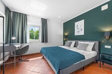 Hochwertige Matratzen und verdunkelnde Vorhänge schaffen besten Schlafkomfort. Ein vollwertiger Schreibtisch mit Beleuchtung bietet die ideale Atmosphäre für Home Office oder eine Workation. Auf Wunsch kann ein Kinderreisebett zur Verfügung gestellt werden. Doppelbett 1,80 x 2,00m, Spiegel, Leselampe am Bett