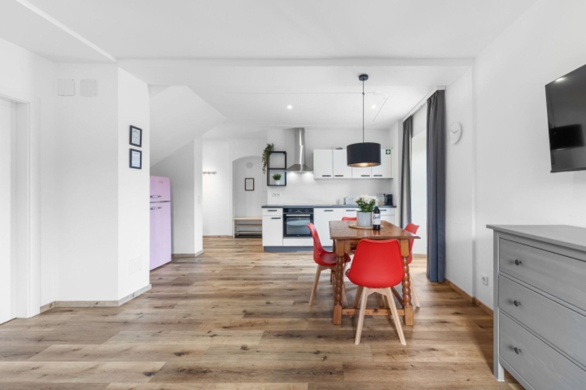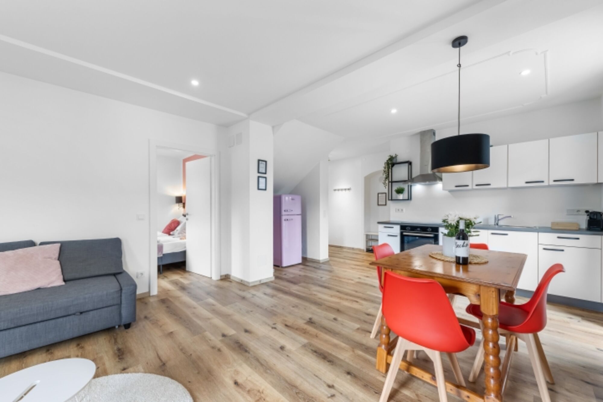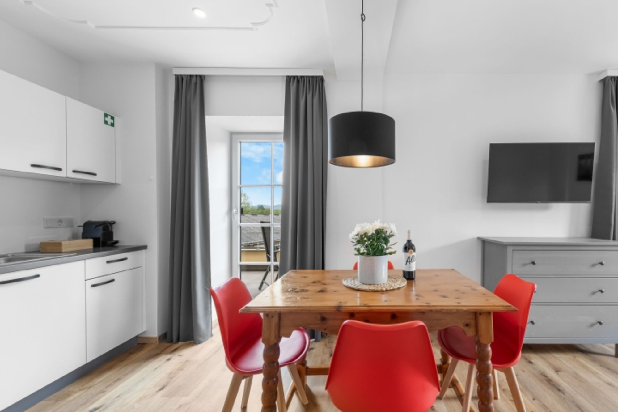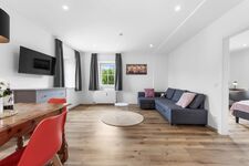 Das Apartment verfügt über ein Schlafzimmer mit bequemen Kingsize-Bett und eine Schlafcouch im Wohnzimmer mit 140x200cm – perfekt für bis zu vier Personen. In der voll ausgestatteten Küche mit Geschirrspüler, NESPRESSO- und Filterkaffeemaschine kannst du deine Lieblingsgerichte zubereiten. Der gemütliche Wohnbereich lädt mit seinem Ecksofa, einem 43-Zoll-Smart-TV sowie einem Essbereich für bis zu vier Personen zum Entspannen und gemeinsamen Beisammensein ein. Für einen gemütlichen Abend stehen auch Brettspiele und ein Kartenspiel zur Verfügung.