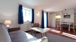 Hell und freundlich gibt sich das Wohnzimmer mit Sofa-Ecke und Essplatz. Im Schlafzimmer finden Sie ein französisches Doppelbett mit neuer Taschenfederkern-Matratzen. Das Sofa im Wohnzimmer lässt sich zum 1,40m breiten Bett ausziehen.