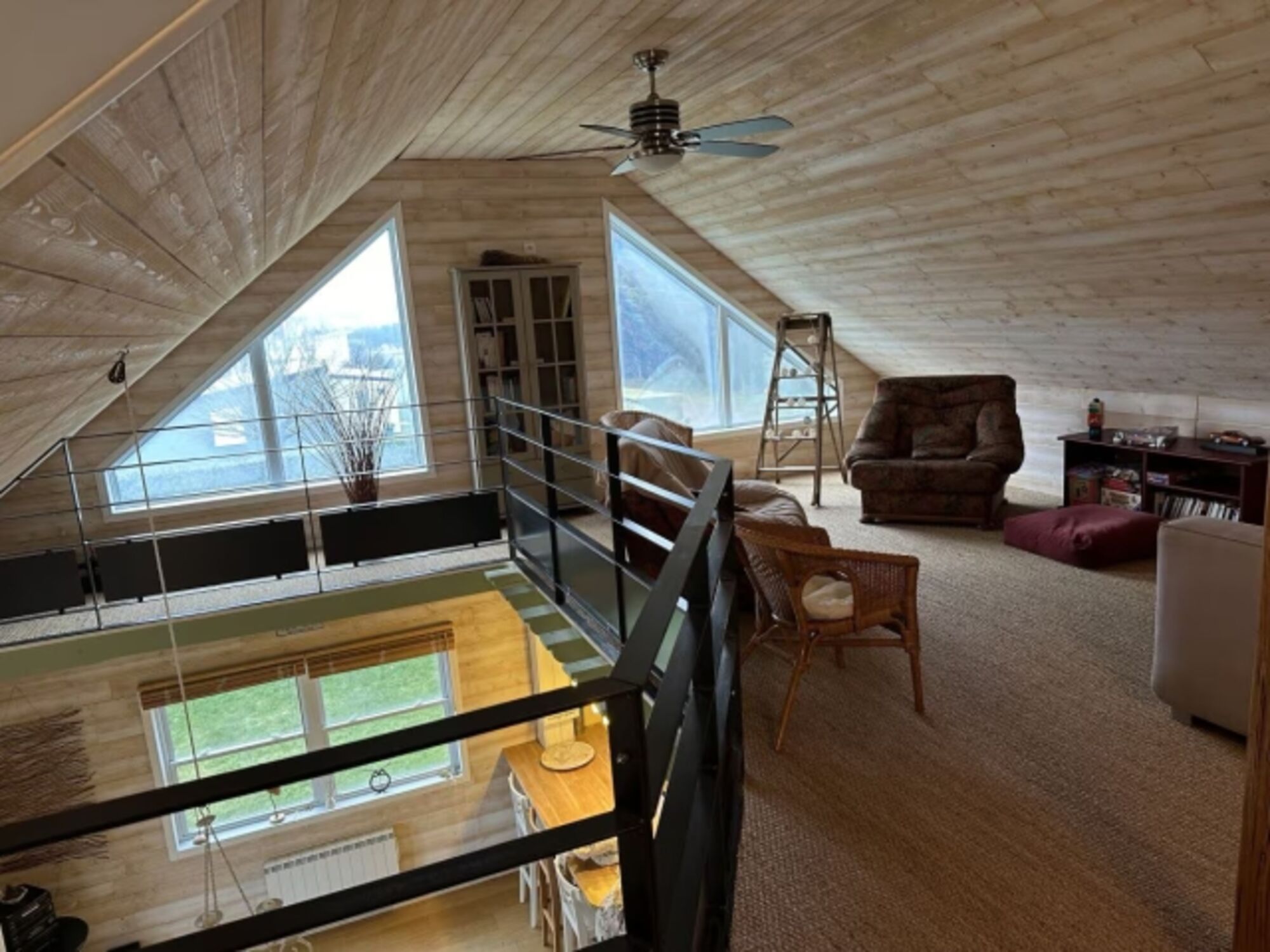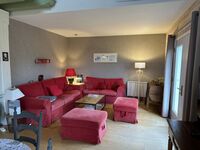 Im ersten Stock (über offene Holztreppe erreichbar) gibt es einen weiteren Wohnbereich mit Sesseln und Sofas und zwei weitere Doppelschlafzimmer mit separatem WC. Draußen gibt es einen komplett eingezäunten Garten mit Terrasse und Gartenmöbeln.