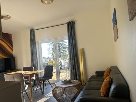 • Modernes Wohnzimmer mit Couch, Esstisch, TV, WLAN und Küchenzeile